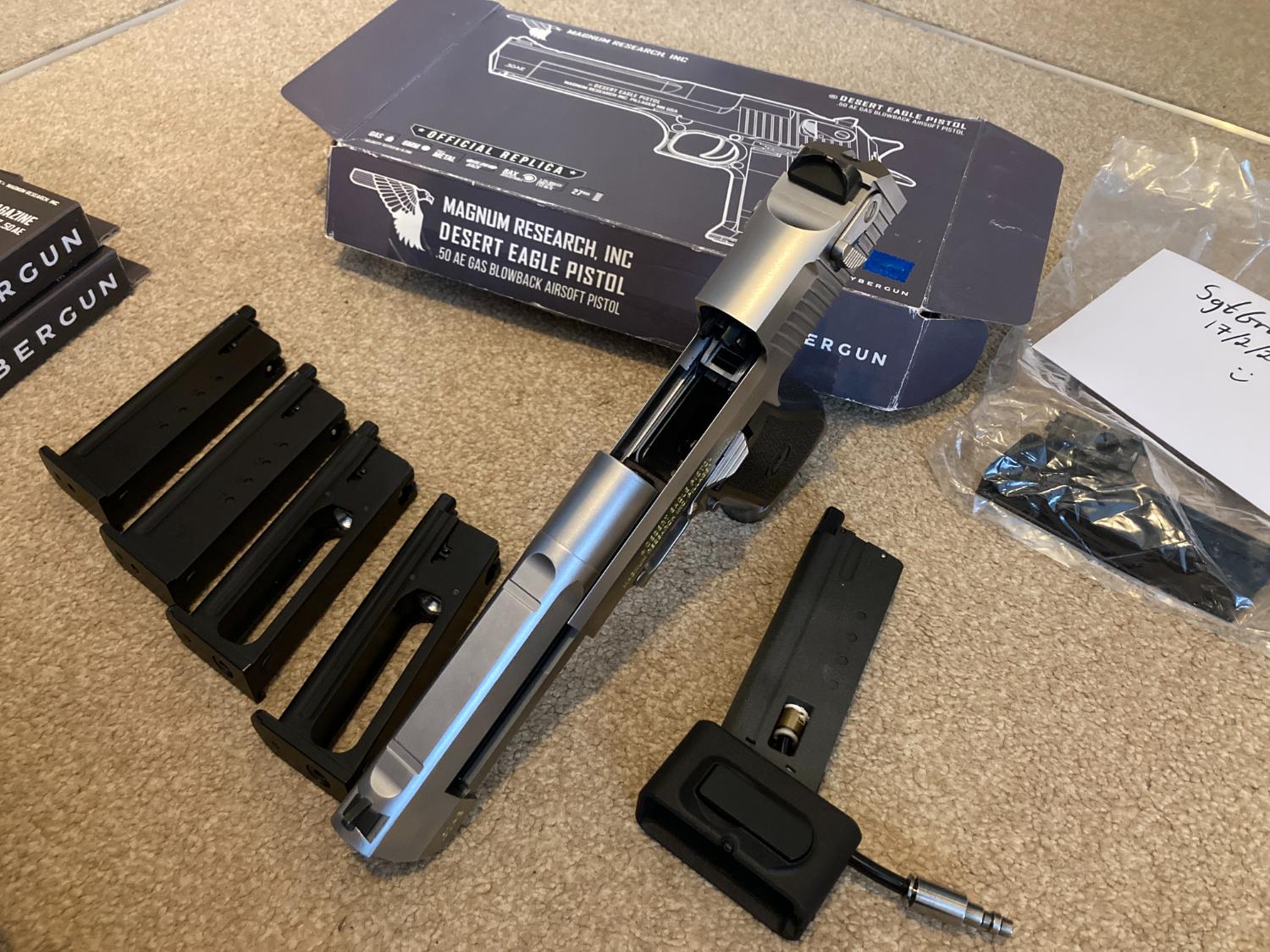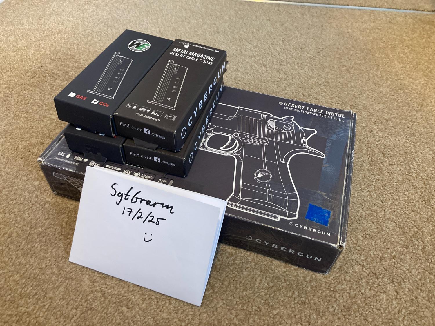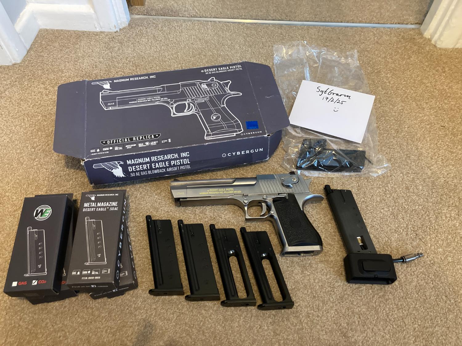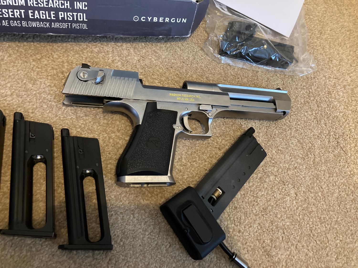 This is the better Cybergun Desert Eagle replica (WE not the silly KWC-based full auto one) with full-travel slide (amazing heavy recoil).