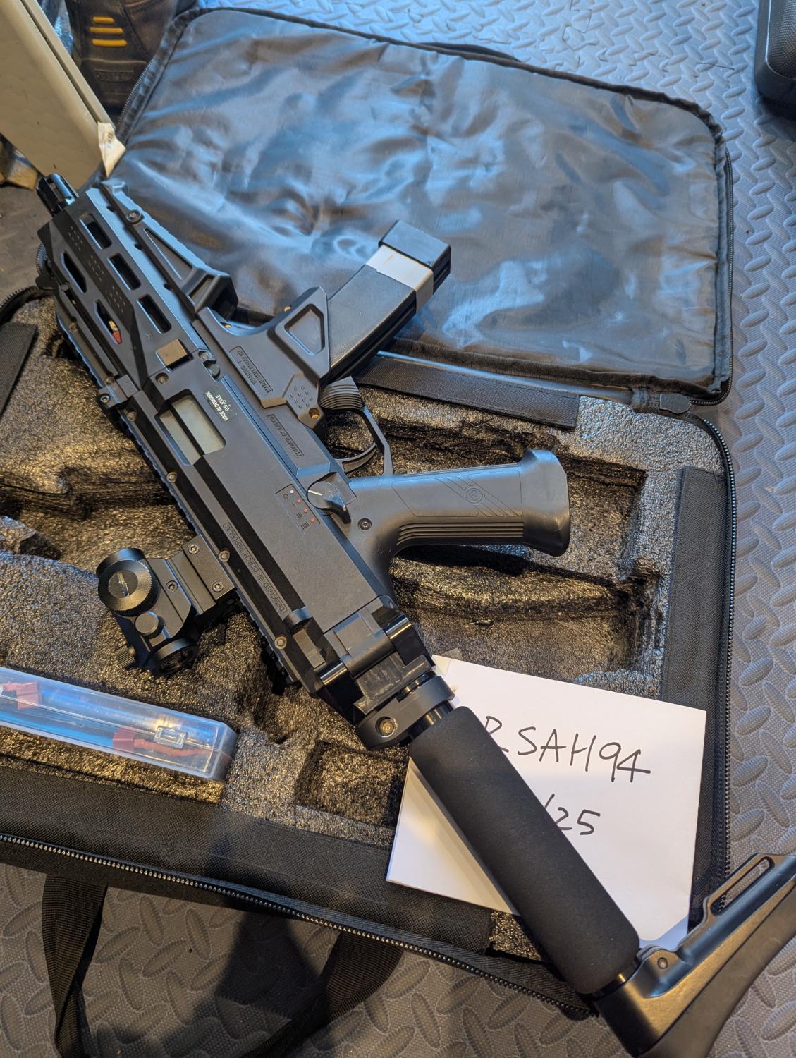 ASG Scorpion Evo 3 A1 with midcap Atek kit, 9x 75 round mid cap mags, repro T1 style red dot sight. Also has fitted Madbull Ace ultralite stock, both original stock and handguard are included.