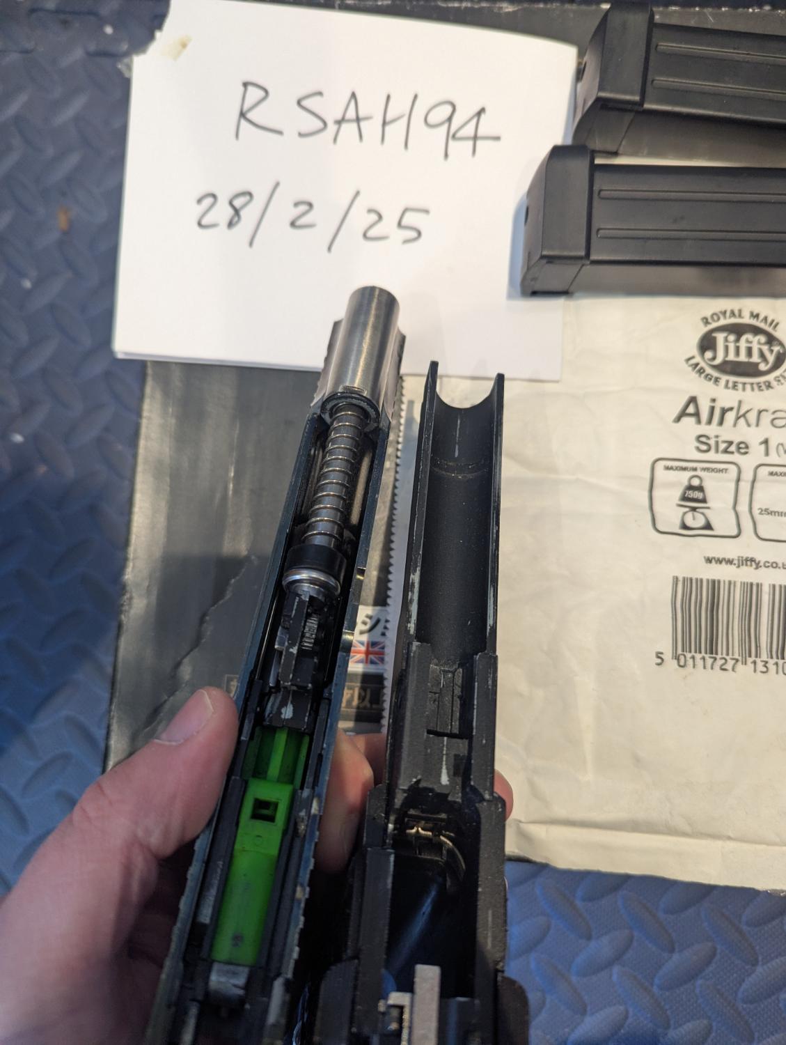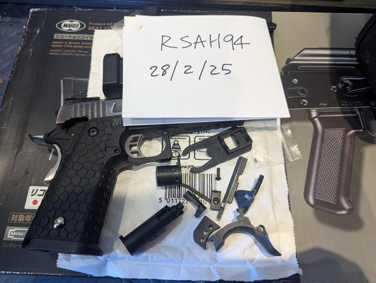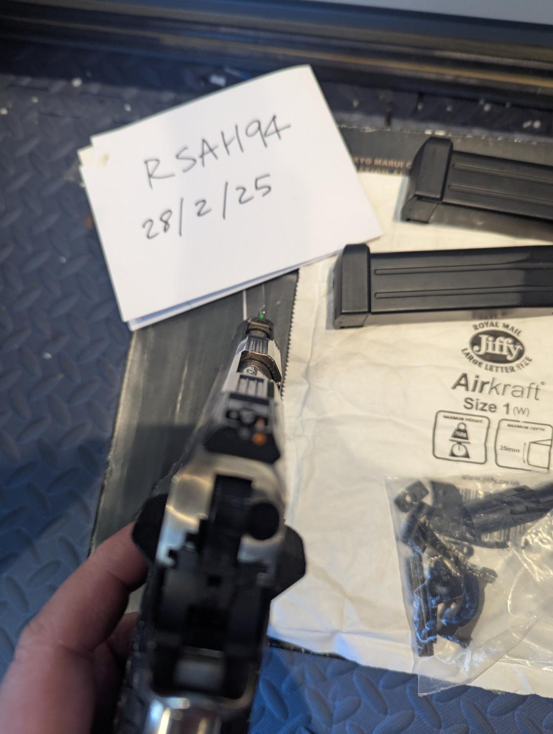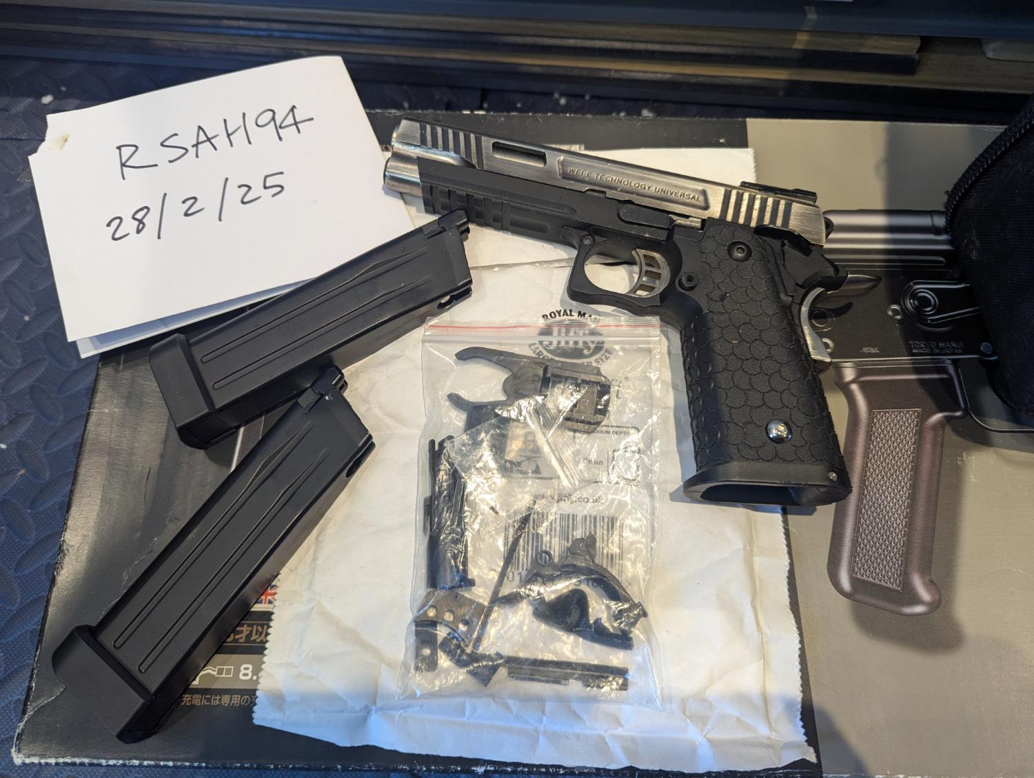 Pistol itself works ok, is missing fibre of rear sight and thumb safety is loose as hell and isn't connected to opposing side, comes with 2 mags but both leak, and the original slide stop broke, has a 1911 slide stop included but doesn't rack particularly great with it fitted, also included are a bunch of 1911/2011 parts as don't have any use for them