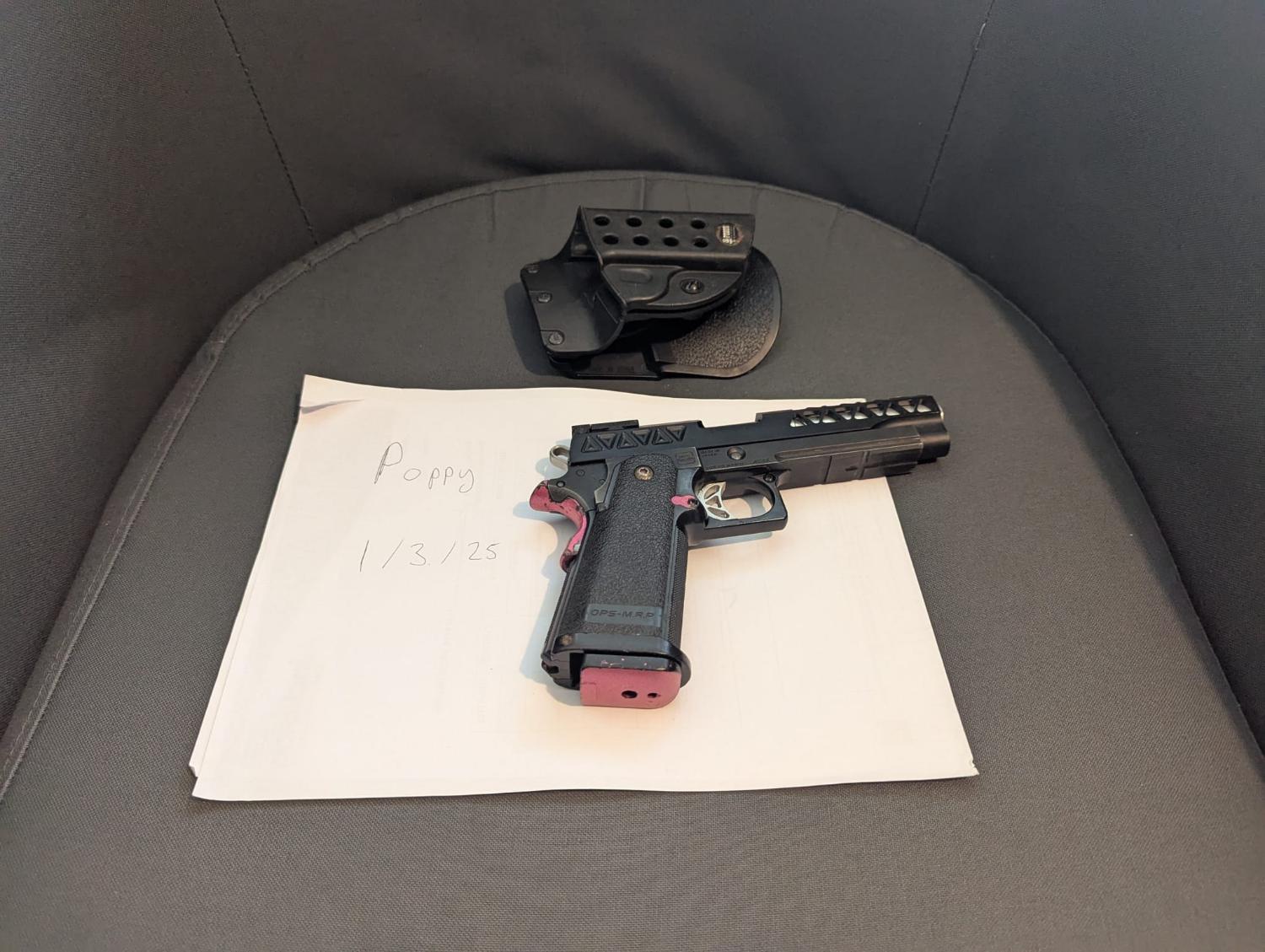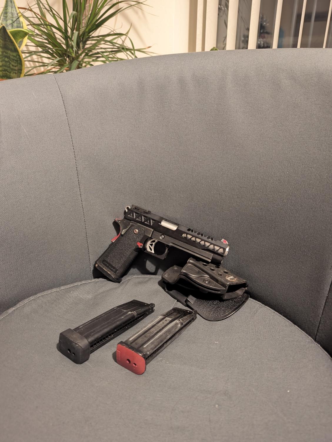 I quit the hobby a few years back and have finally gotten around to shifting my old kit. This is a modified Tokyo Marui Hi-Cappa. The slide is an aluminium replacement with a new recoil spring and outer barrel. The rear sight is damaged and would need replacing. This hasn't been used or serviced in a while so would need a good clean and the mags will need servicing as well. I will also be selling the hip friction holster as pictured above.