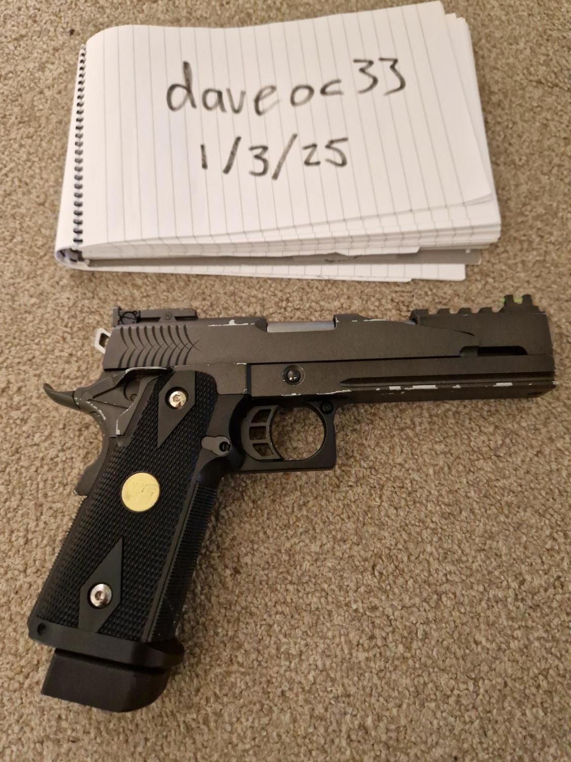 WE hi capa shoots at around 305fps with 0.2g bbs. It looks a bit worn and occasionally locks back on empty. I'm after £50 including postage. Comes with 1 leak free mag.
