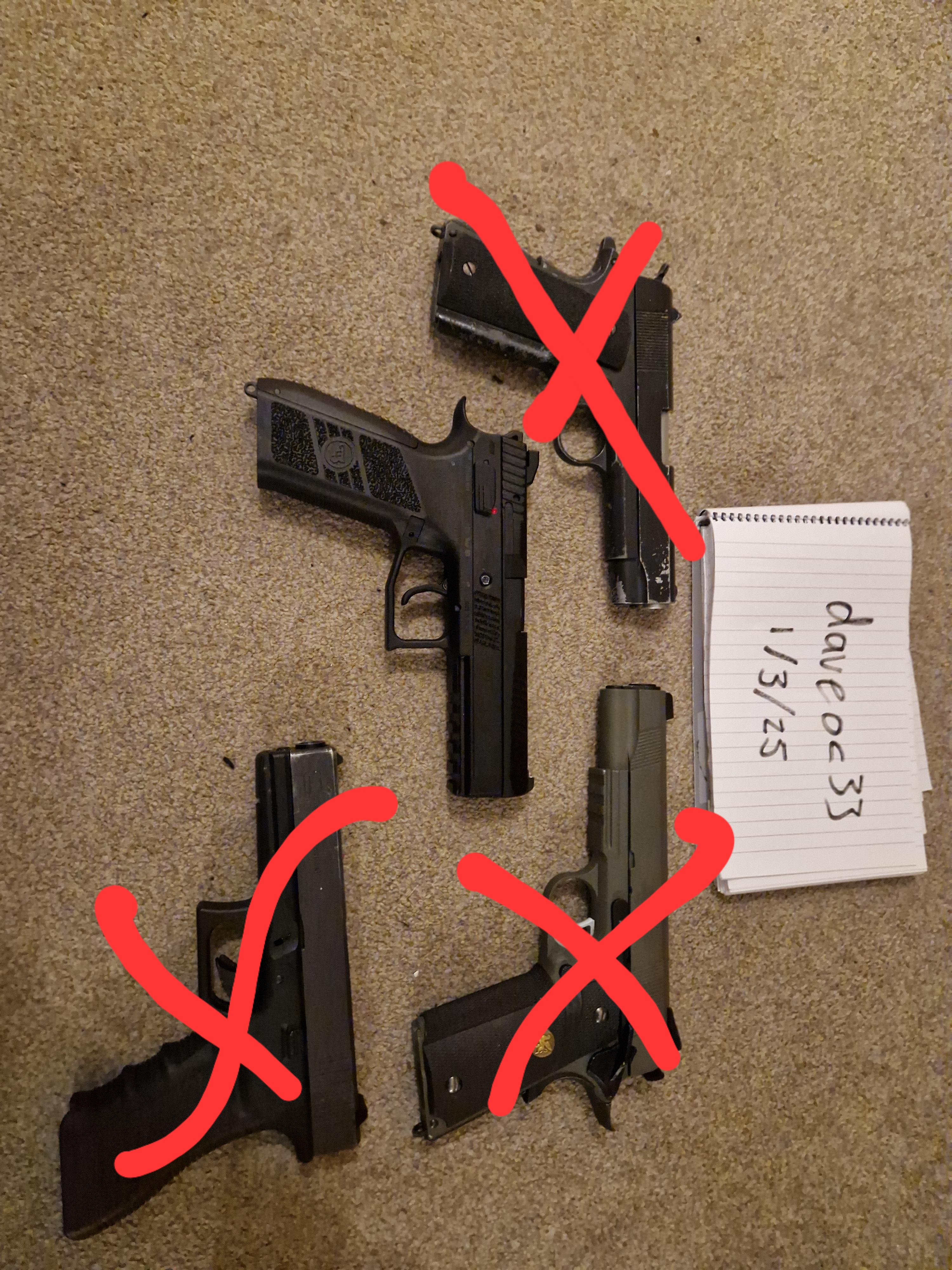 Bottom left. Asg cz p-09 metal slide shoots at 310 fps but the slide occasionally gets sticky and fails to slide forward into battery. Occasionally it'll try to full auto but won't cycle back far enough to load a bb.