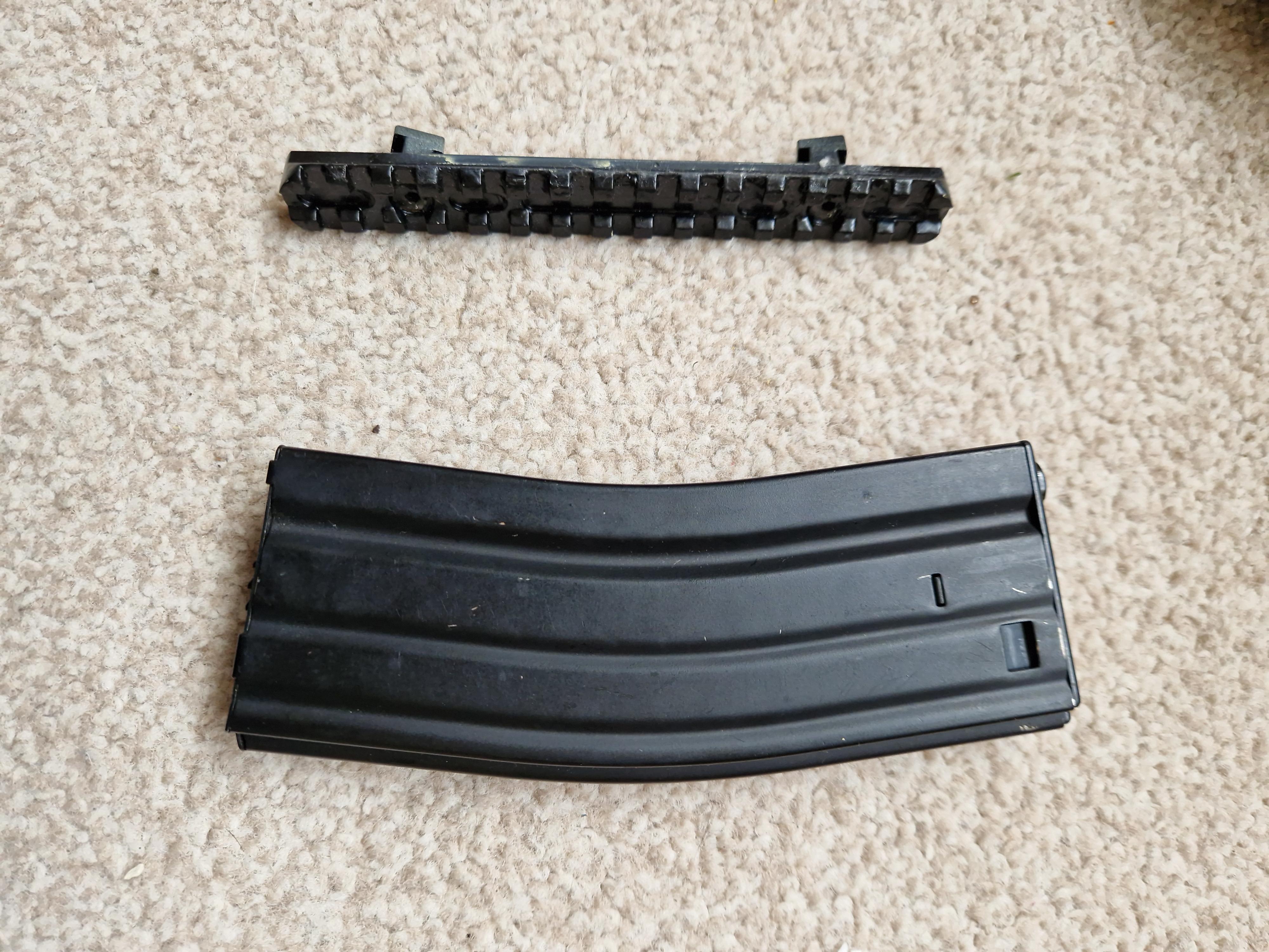 It comes with 1 high cap mag and a rail section.