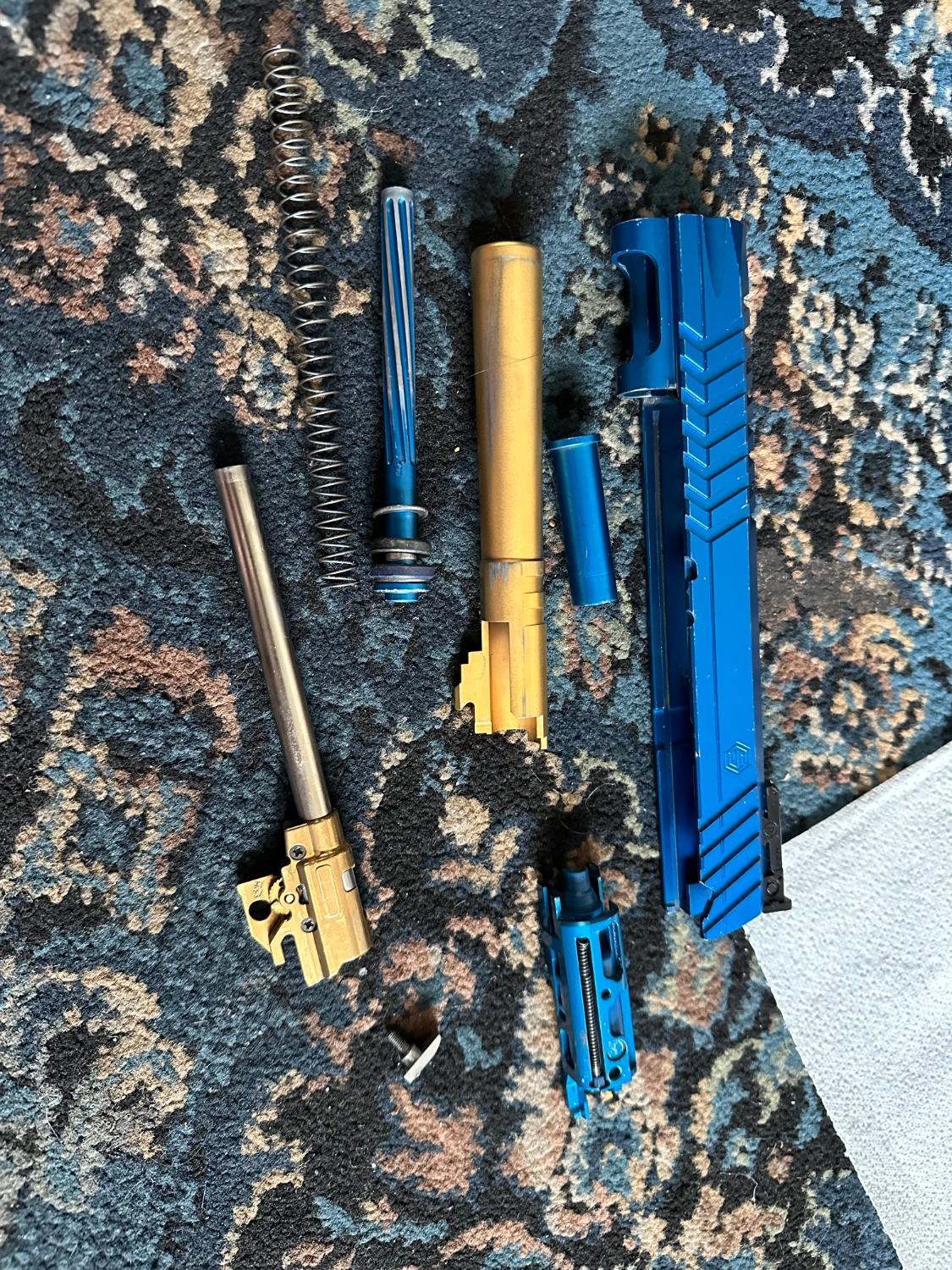 Capa upper consisting of Airsoft masterpiece brass hop unit, maple leaf rubber, PDI inner barrel. Cowcow bbu with edge nozzle 140% return spring, edge guide rod and plug, AM outer barrel. Slide I think is edge but not 100% with a TM rear sight and no front sight, want £200 all in including postage