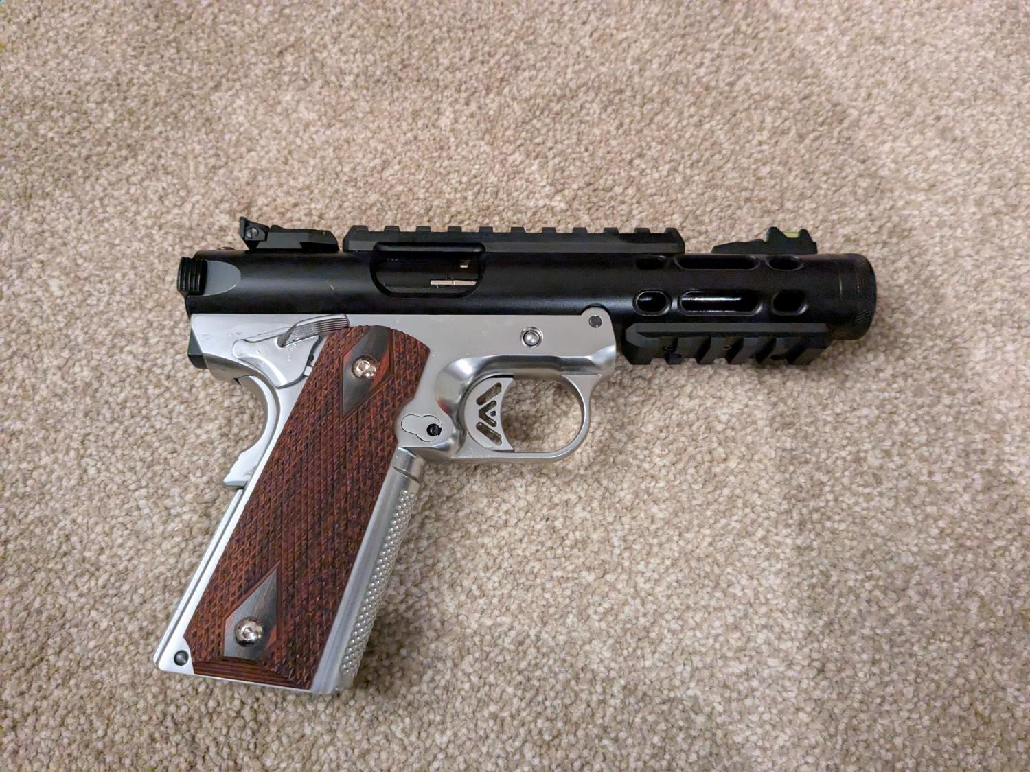 WE Galaxy 1911 with wood grips. Made to look like a Ruger 22/45. Amazing gas efficiency and hops .30g bb's with ease.