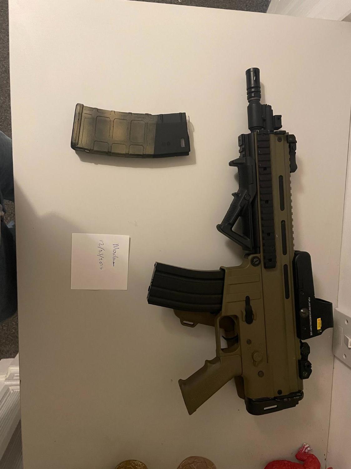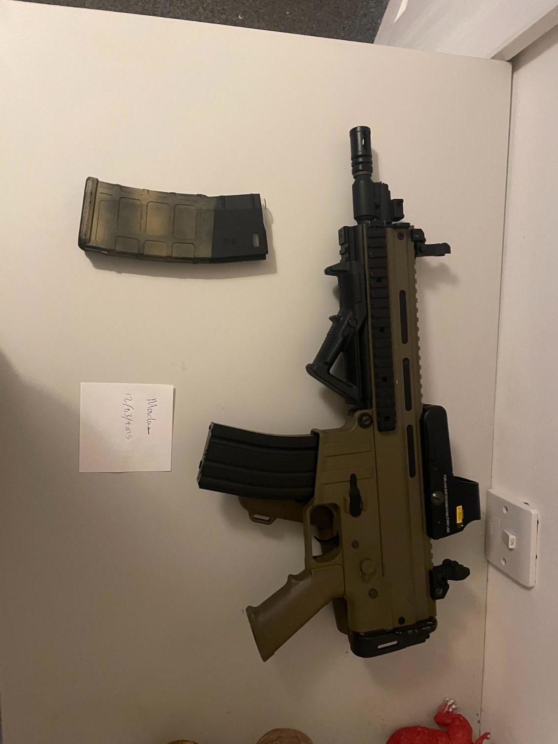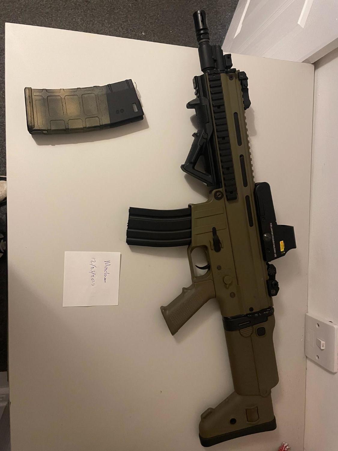 Angled Foregrip, Iron Sights, Holographic Sight, 2 Mags, Battery