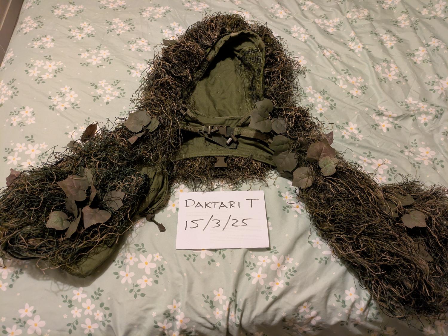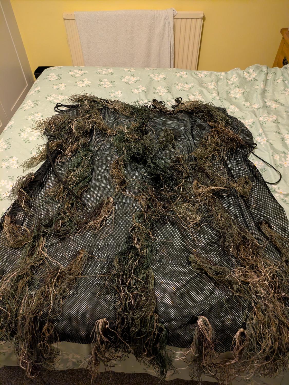 Ghillie Viper Hood & Cape – An olive green hood paired with a detachable black cape, both fully covered with yarn and artificial ivy leaves for maximum camouflage. I’ve put a fair bit of effort into crafting this, but ghillie suits just aren’t my thing. Along with the hood and cape, I’ll also include extra ivy leaves and additional yarn for further customization.