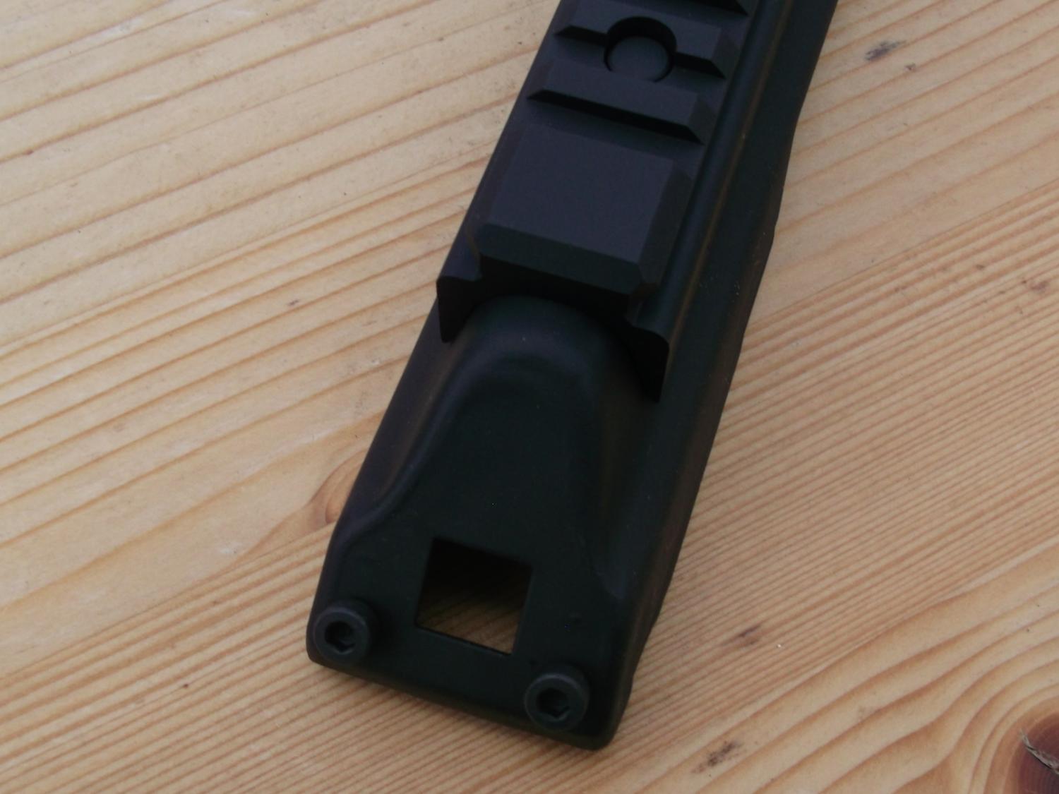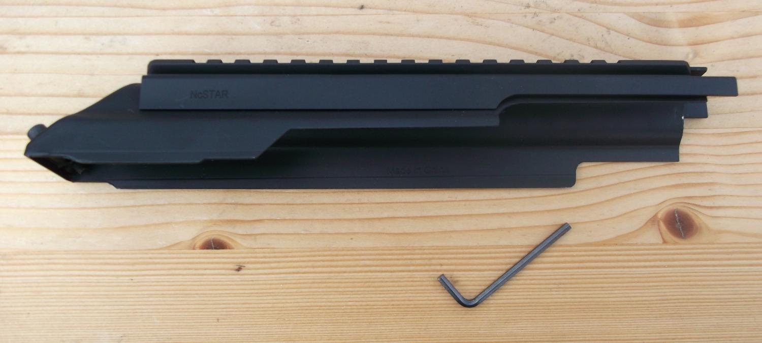AK Picatinny Rail Mount, Receiver top cover. By NcStar. Aluminium rail section on Steel top cover. Has two screws to secure cover to maintain zero. To fit real steel AK rifles, may fit airsoft GBB AK rifles?