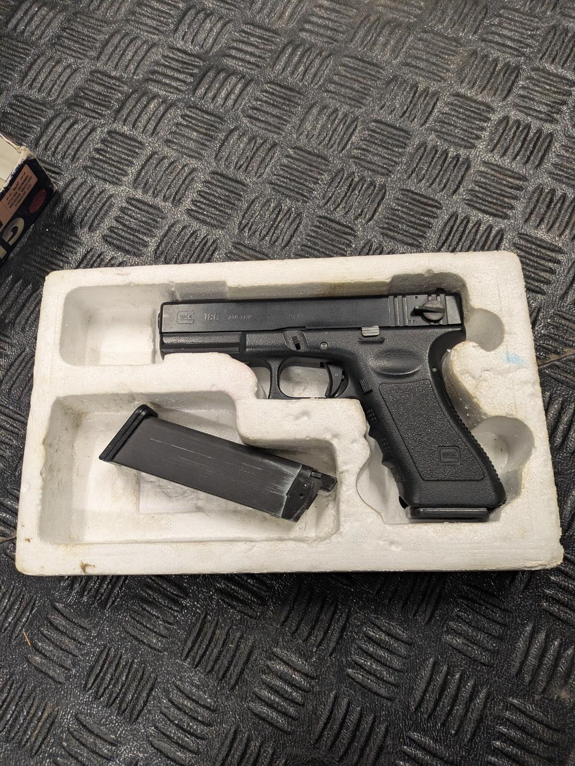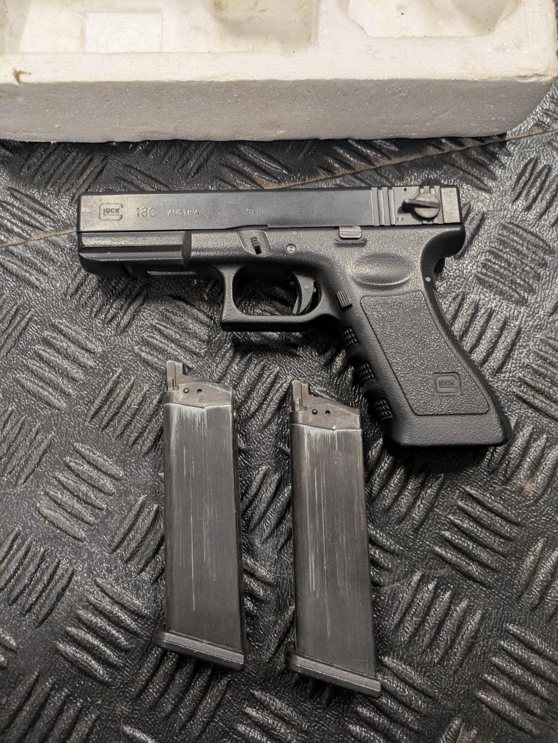 This Glock 18c has been sat in a cupboard in my room at my parents house for ~15 years but as they have moved house it was given back to me. It is probably about 20 years old so may require some TLC before being used in anger. I do not have any gas so it is untested. Was working fine last time it was used. Comes with 2 standard size magazines.