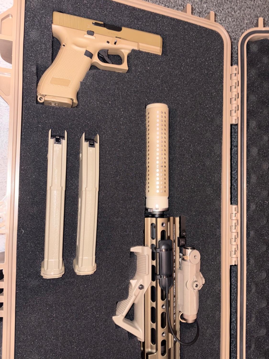 gun case and accessories don’t come with the purchase, had a upgraded rear stock so battery will sit in the buttock and has been changed to deans