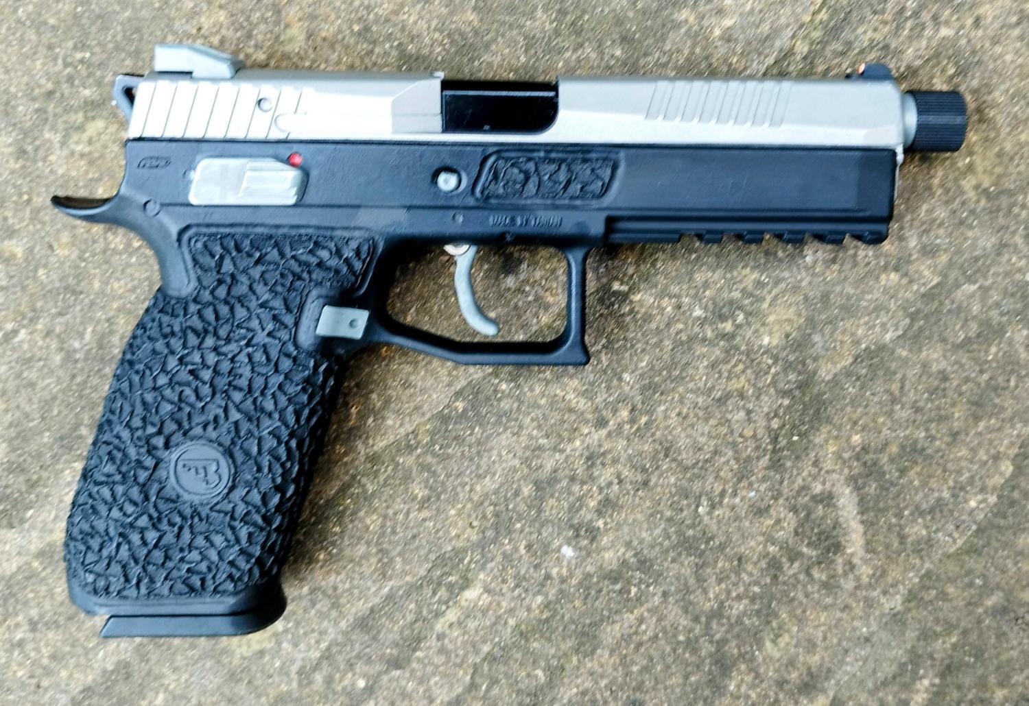Up for sale is my custom-made CZ P-09 airsoft pistol, built for serious enthusiasts! This beast features a gunmetal slide for durability and a sleek look, paired with a custom stippling grip that ensures you’ll have a perfect, non-slip hold even during the most intense games.