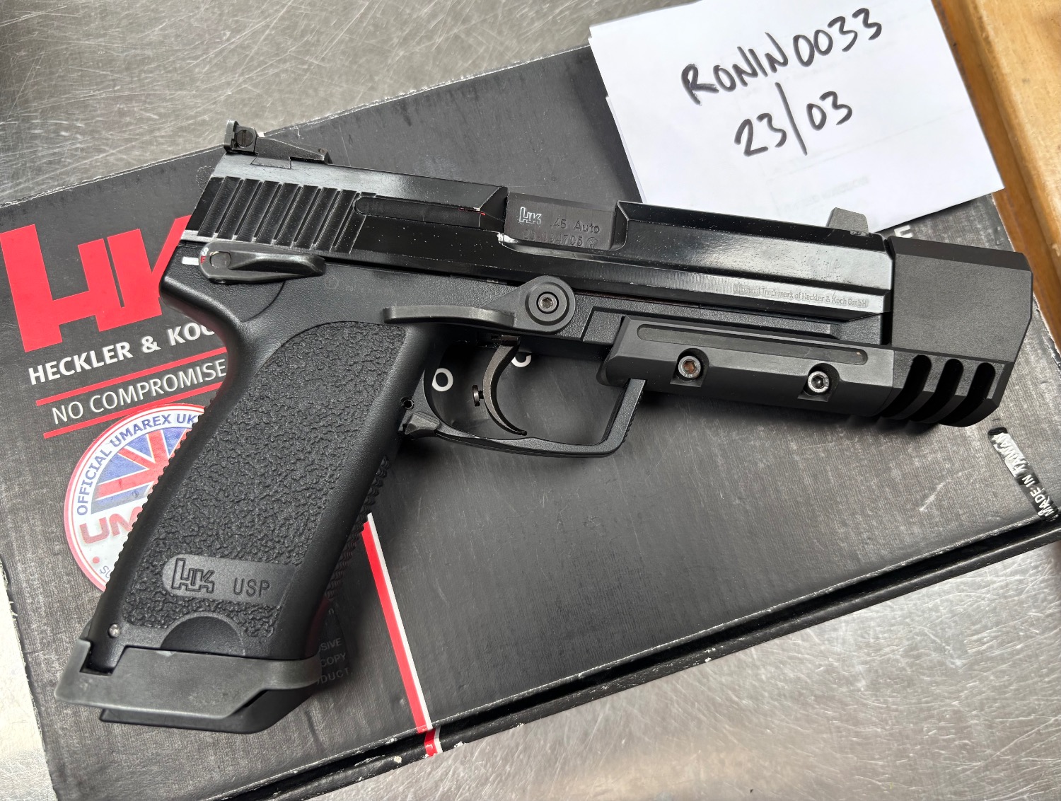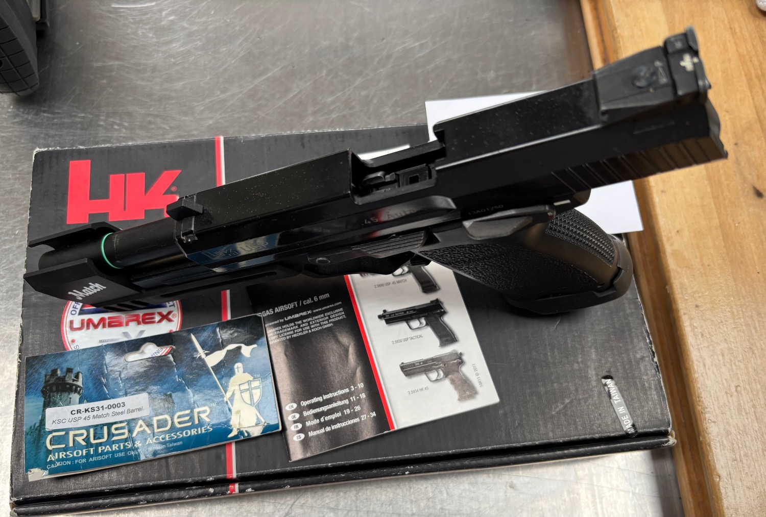 Has had a brand new metal (trademarked) compensator, a new Crusader Steel Outer Barrel, new right side slide release, new front sight, and new CowCow piston head.