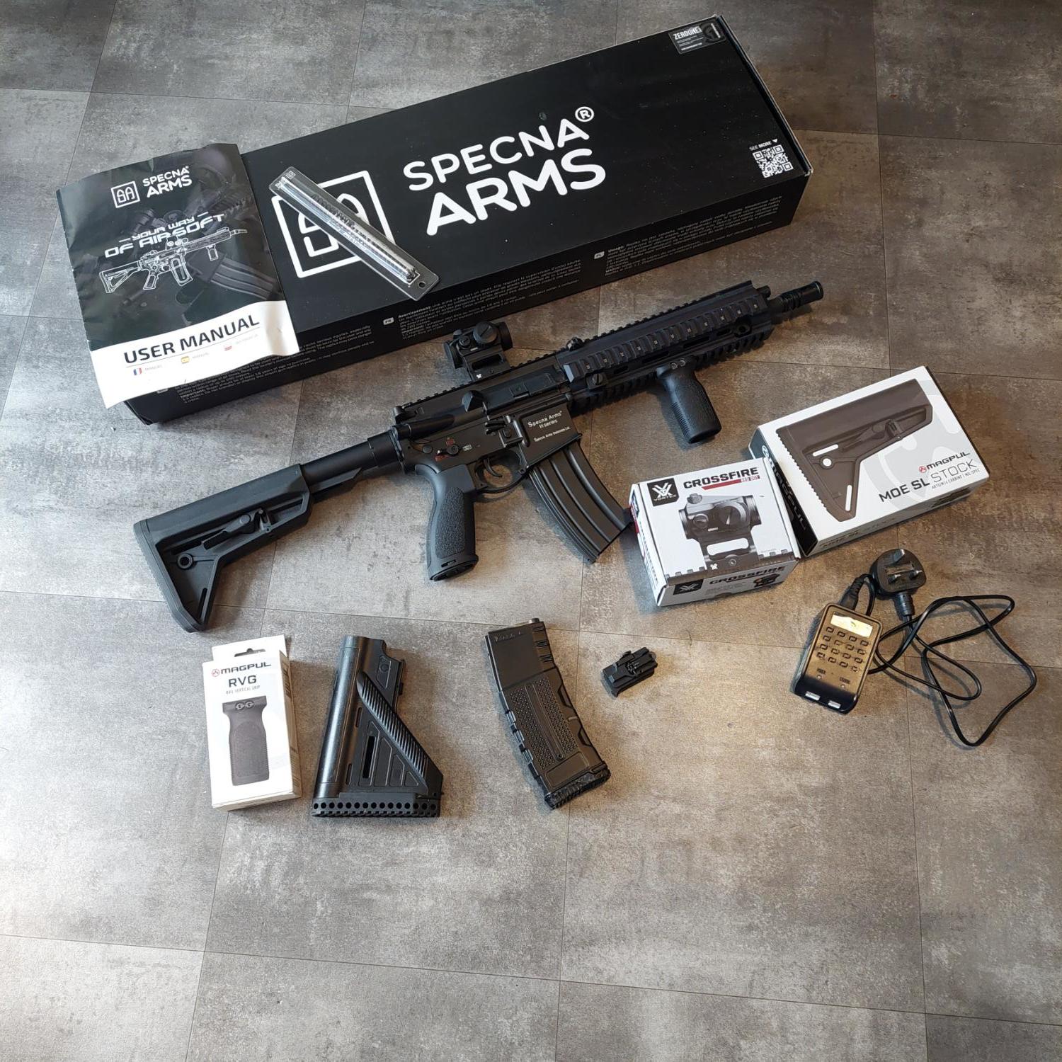Plus battery, charger, original stock, extra mag , manual , spare spring.