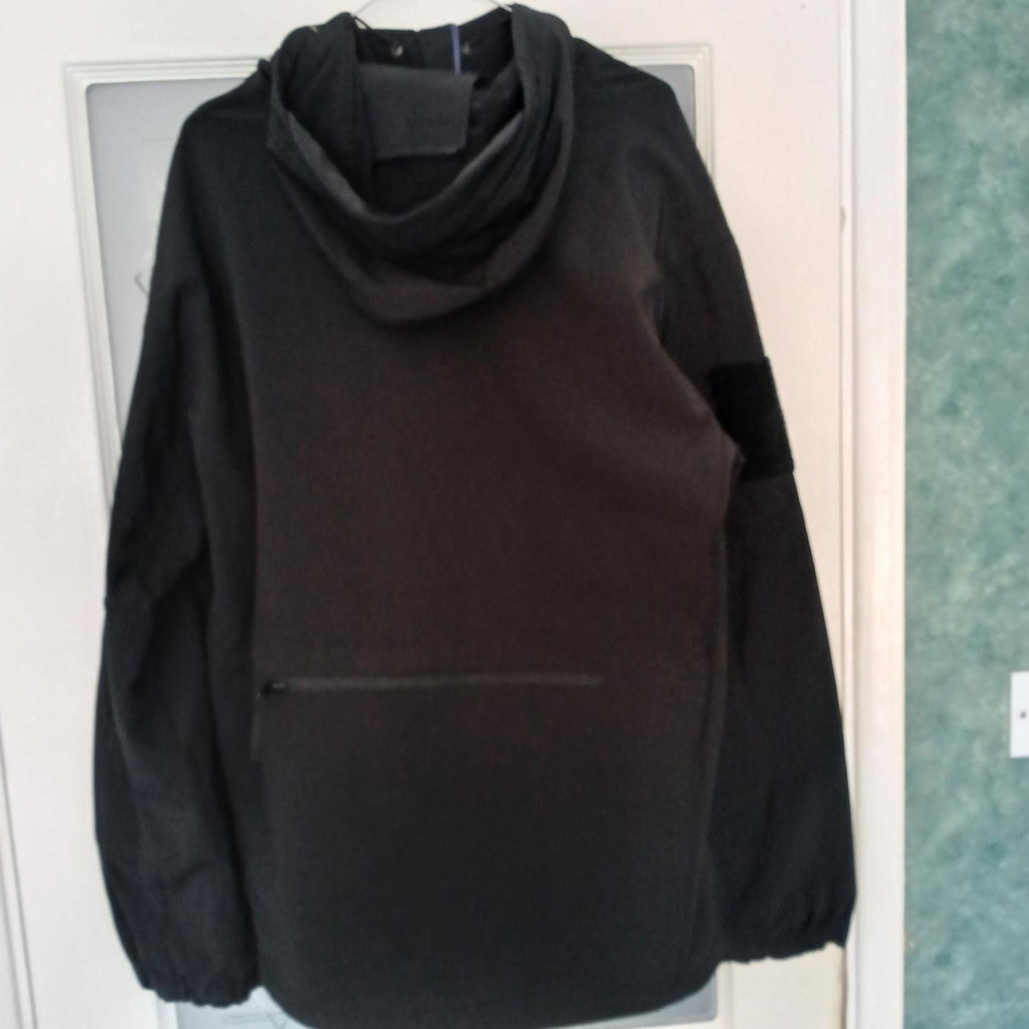 It also has pit zips for extra ventilation, a peaked hood that can be rolled down to make a collar, & the jacket itself can be rolled up in to it's own back pocket, as shown in the pics.