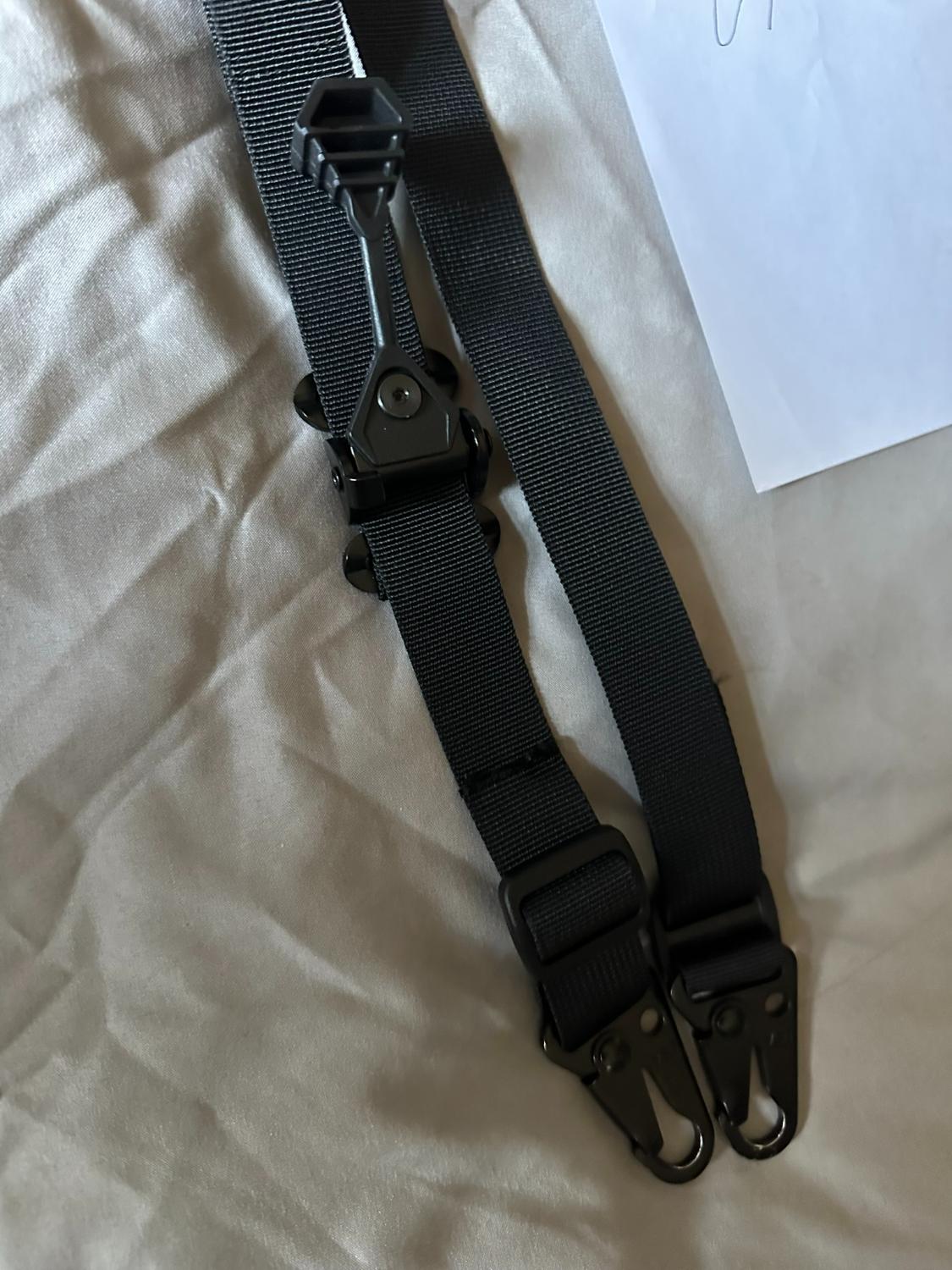 Comes with 2 steel sling hooks. originally around 40 pound in total, 20 quid. (including postage and paypal fees) as ive cut one of the straps shorter as it was too long for me.