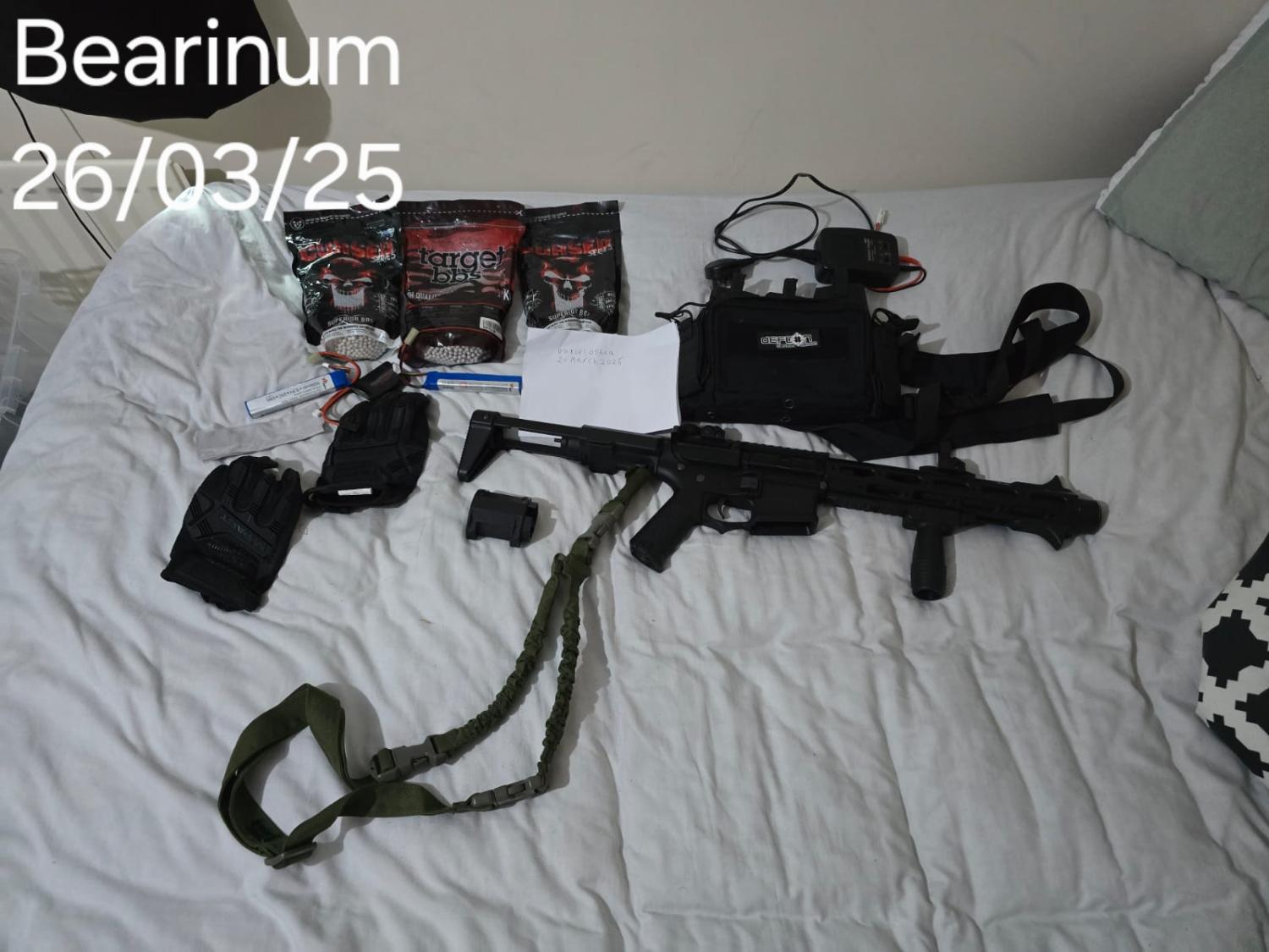 Chest rig, magazines, charger, battery, battery extension, barrel stabiliser, large mechanix gloves, foregrip