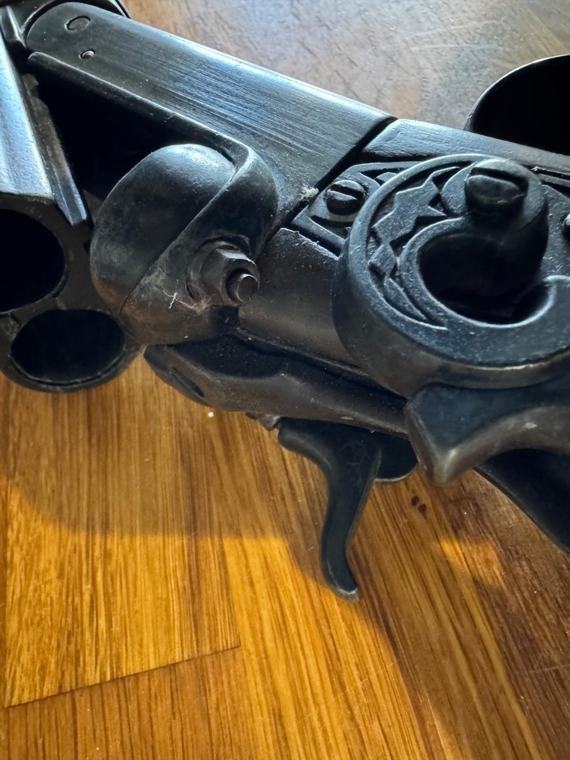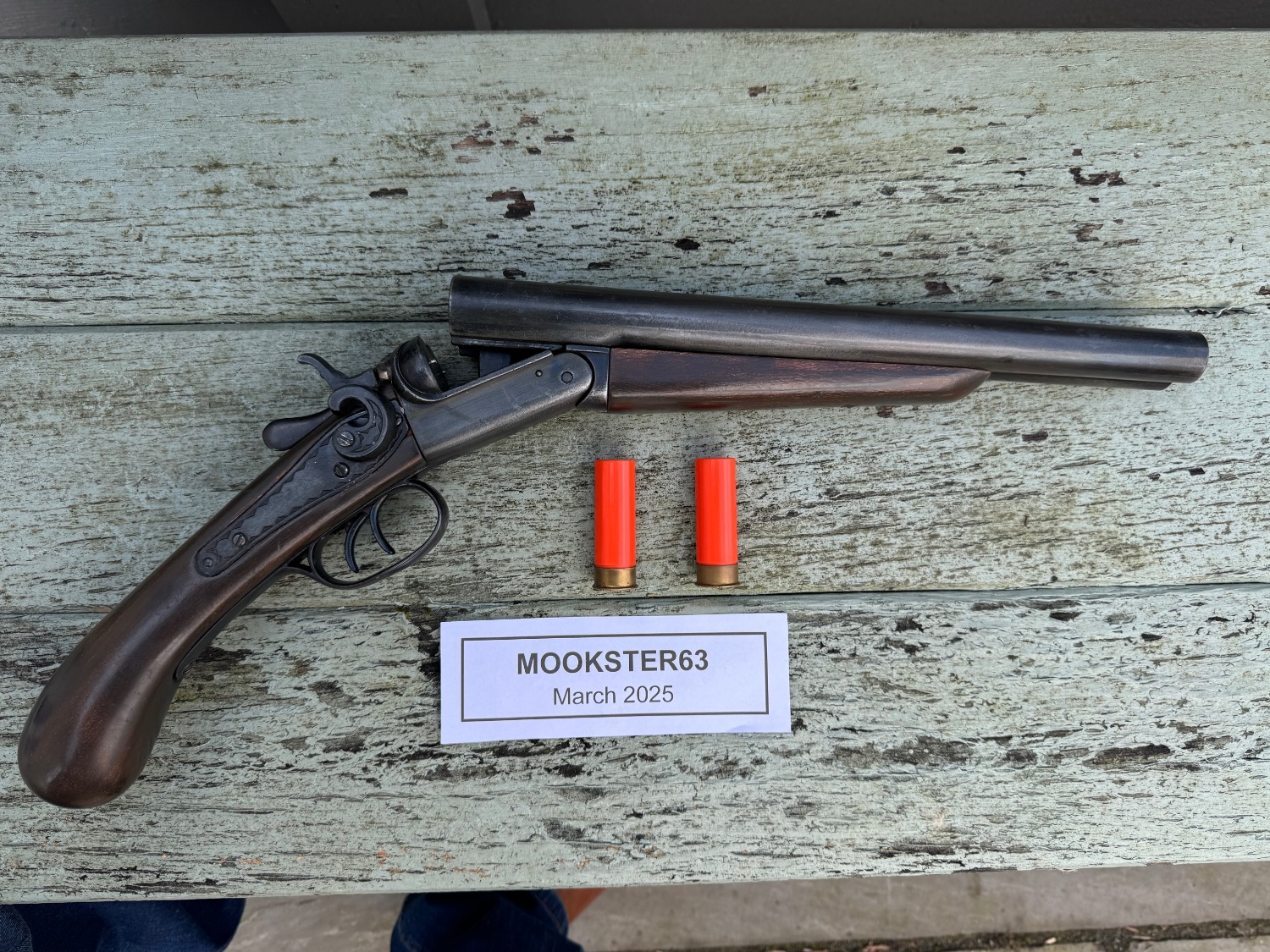 This is a converted Denix coach gun which you can’t get anymore that break open, full metal and wood uses PPS gas shotgun shells through open barrel, looks the part. always gets a lot of interest. Converted with genuine shotgun firing pins.