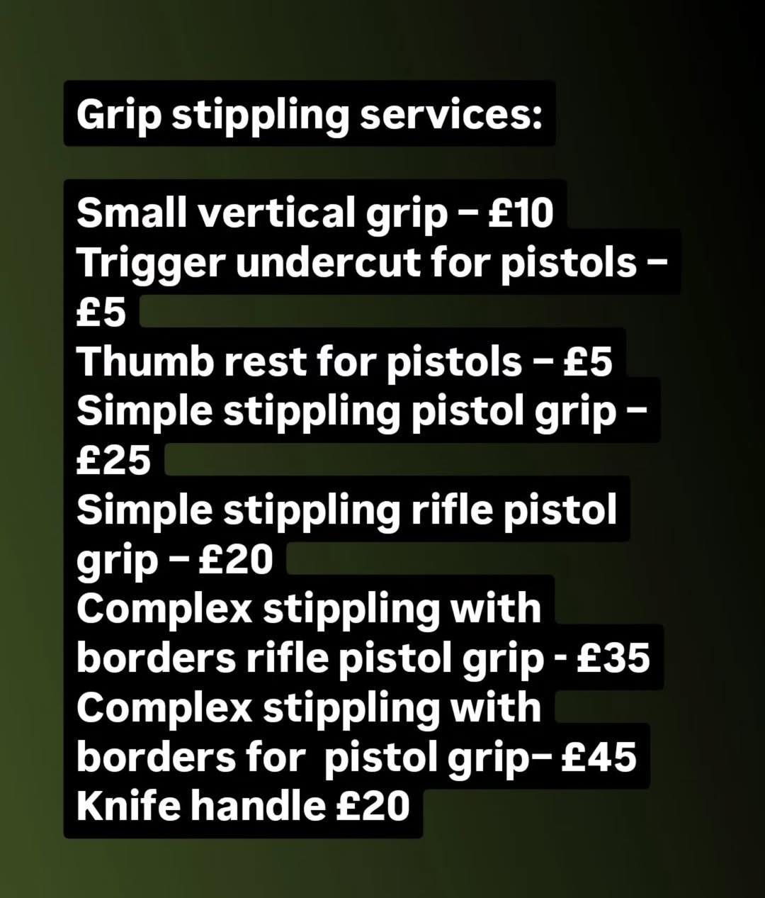 Hey trigger-happy mates! Want your airsoft pistol grip to feel like it was made just for you? I do custom stippling to give you that extra grip and badass look!