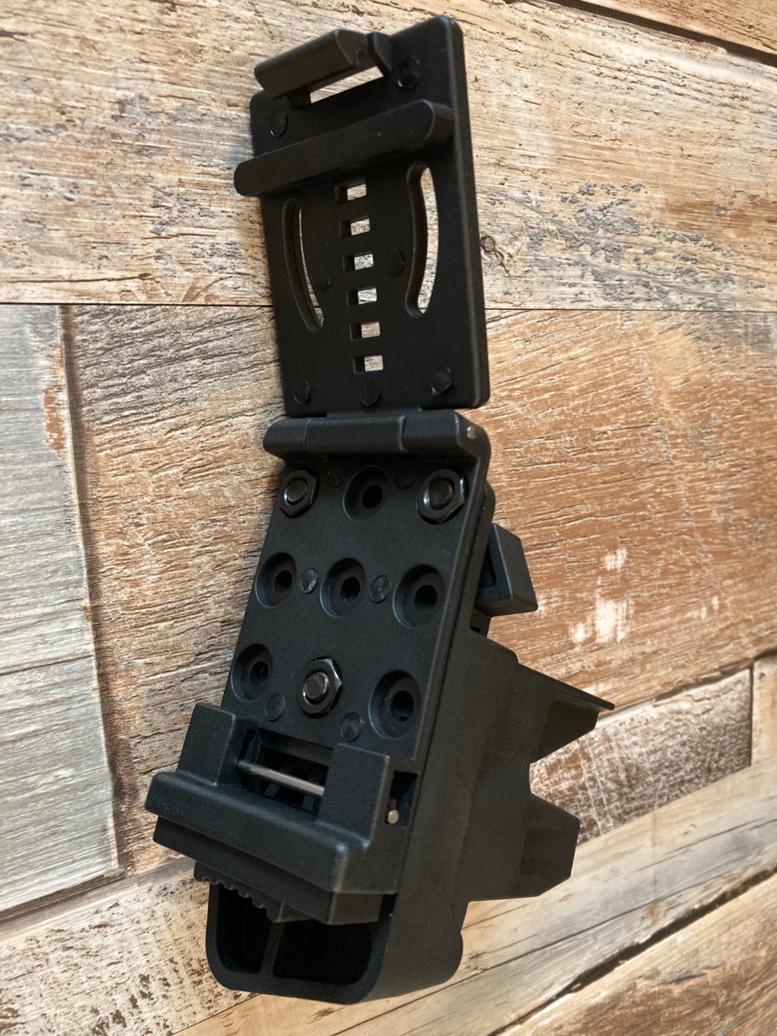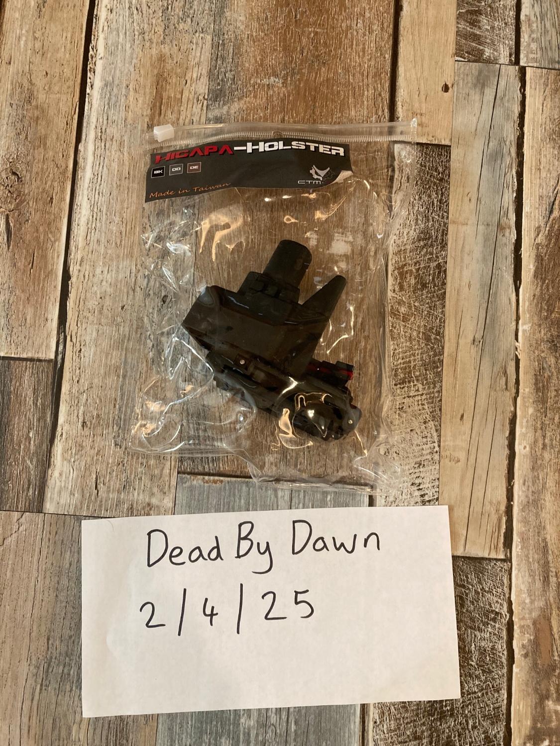Brilliant holster from CTM locks onto HiCapa trigger guard, thumb release has lock on aswell, pushing down on the releases pistol giving very quick unholstering and reholstering