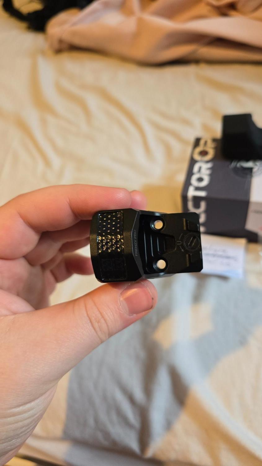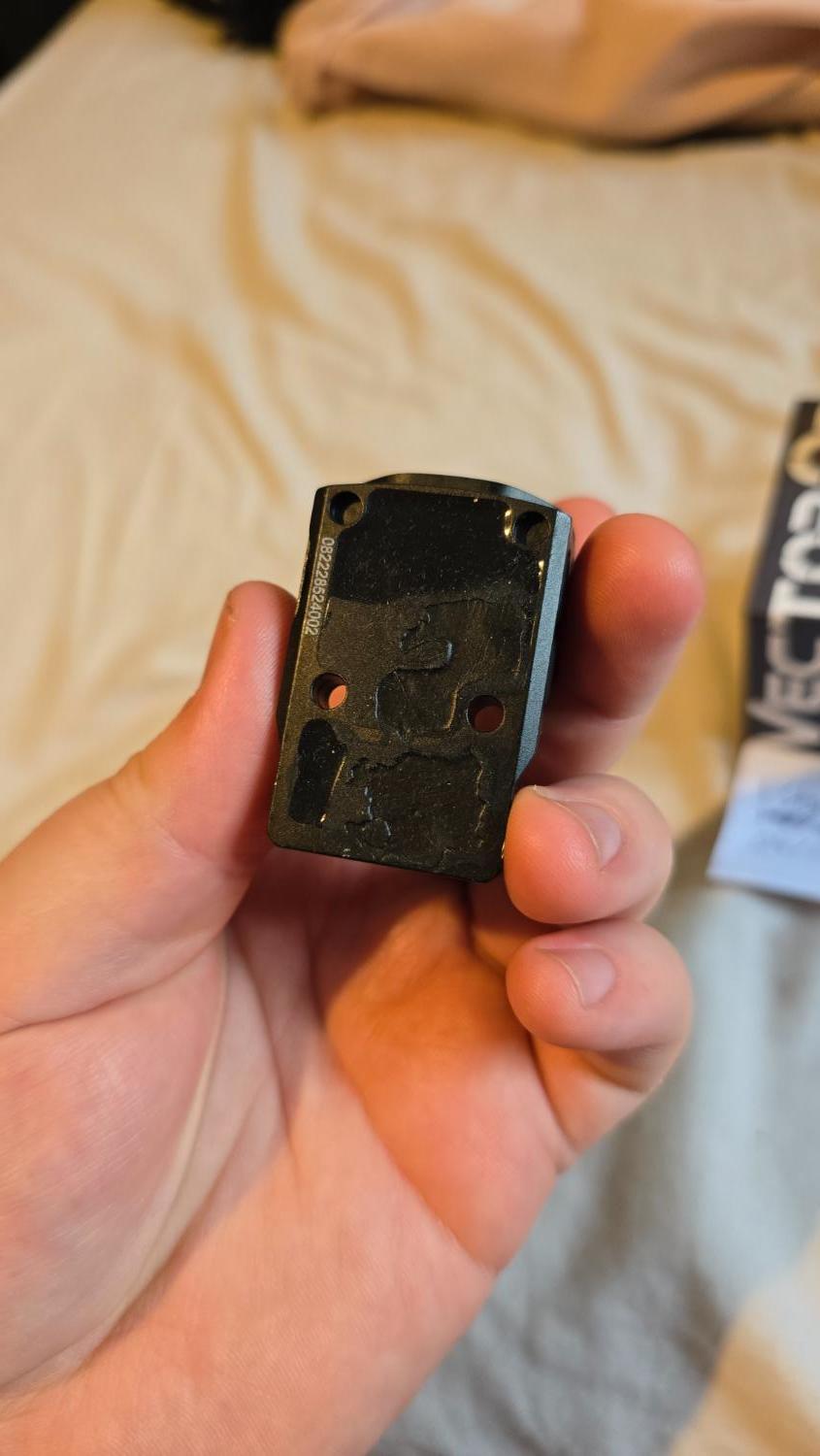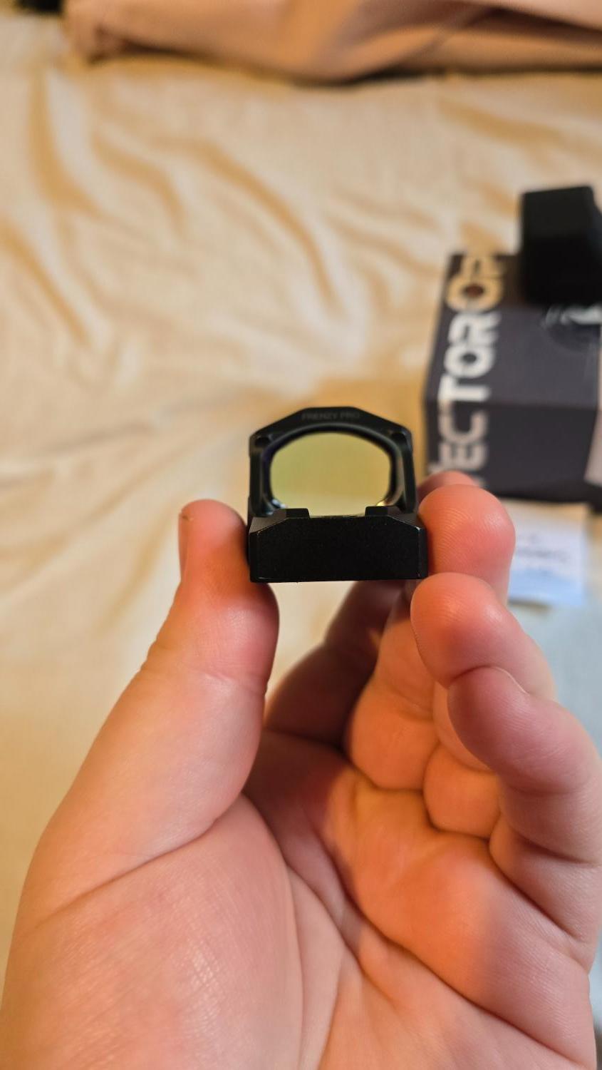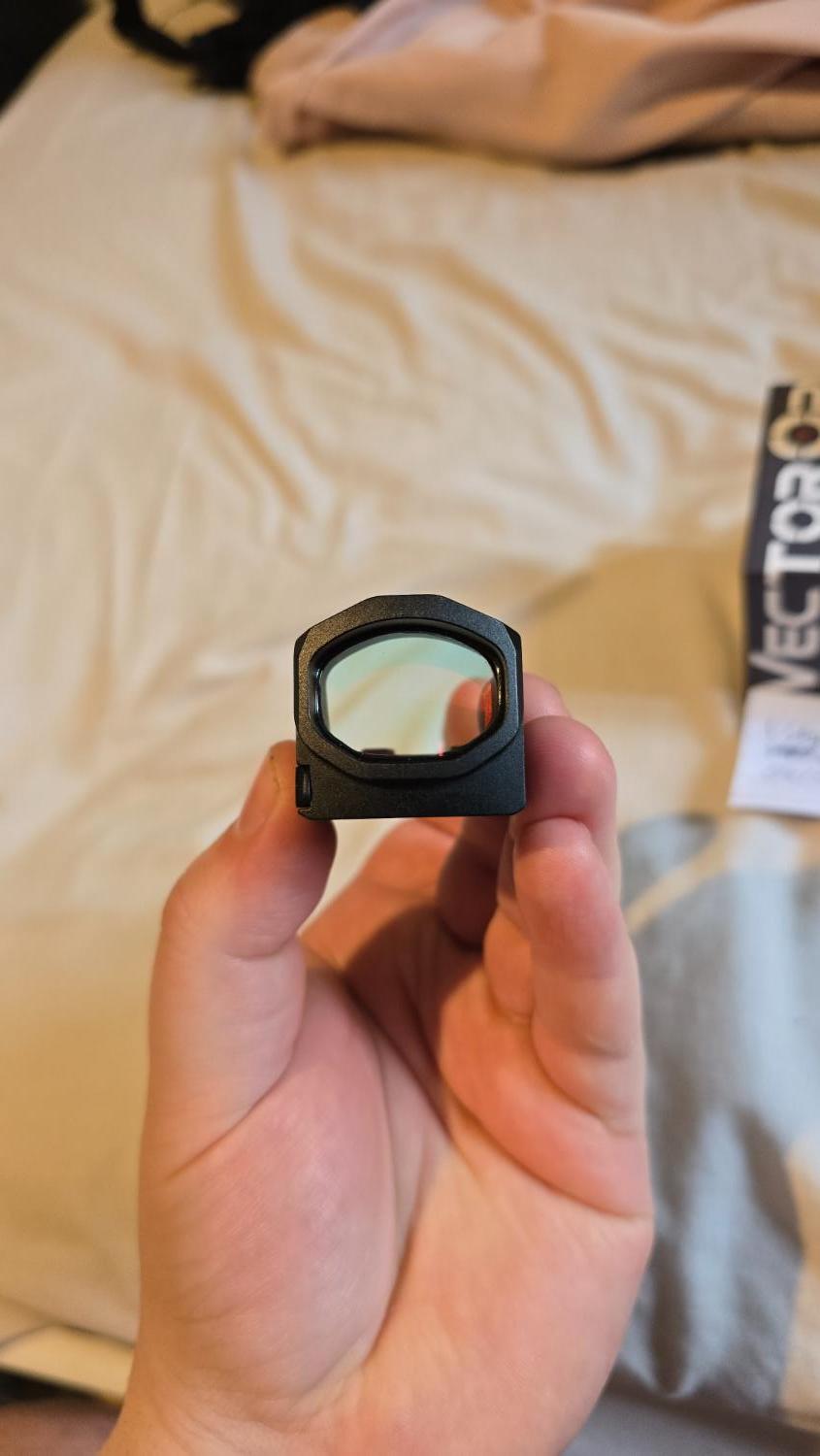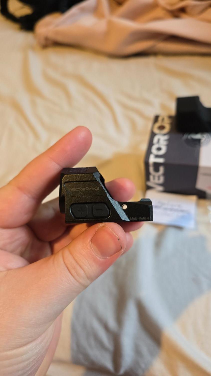 Selling my used Vector Optics Frenzy-X as I got a new one, The pad on the bottom is damaged due to it sticking to the original plate it came with. Pretty much had to destroy the plate to get it off. As well the included Vector Optics tool broke off on one of the battery screws. Optic still works and has solar panel so can still be used outside just fine.