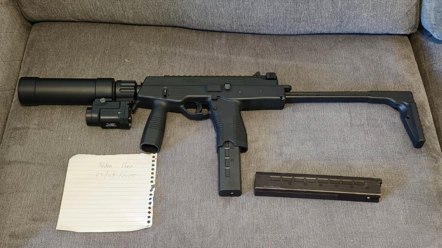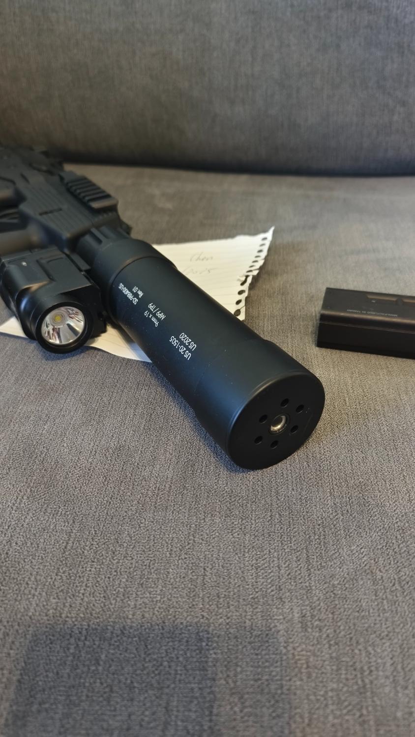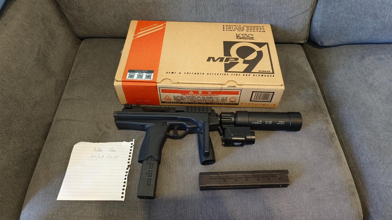 Comes with 2 gas tight mags, MP9 QD suppressor with inner barrel extension, WADSN Zenitco Klesch 2P flashlight (battery to be bought separately) and original packaging