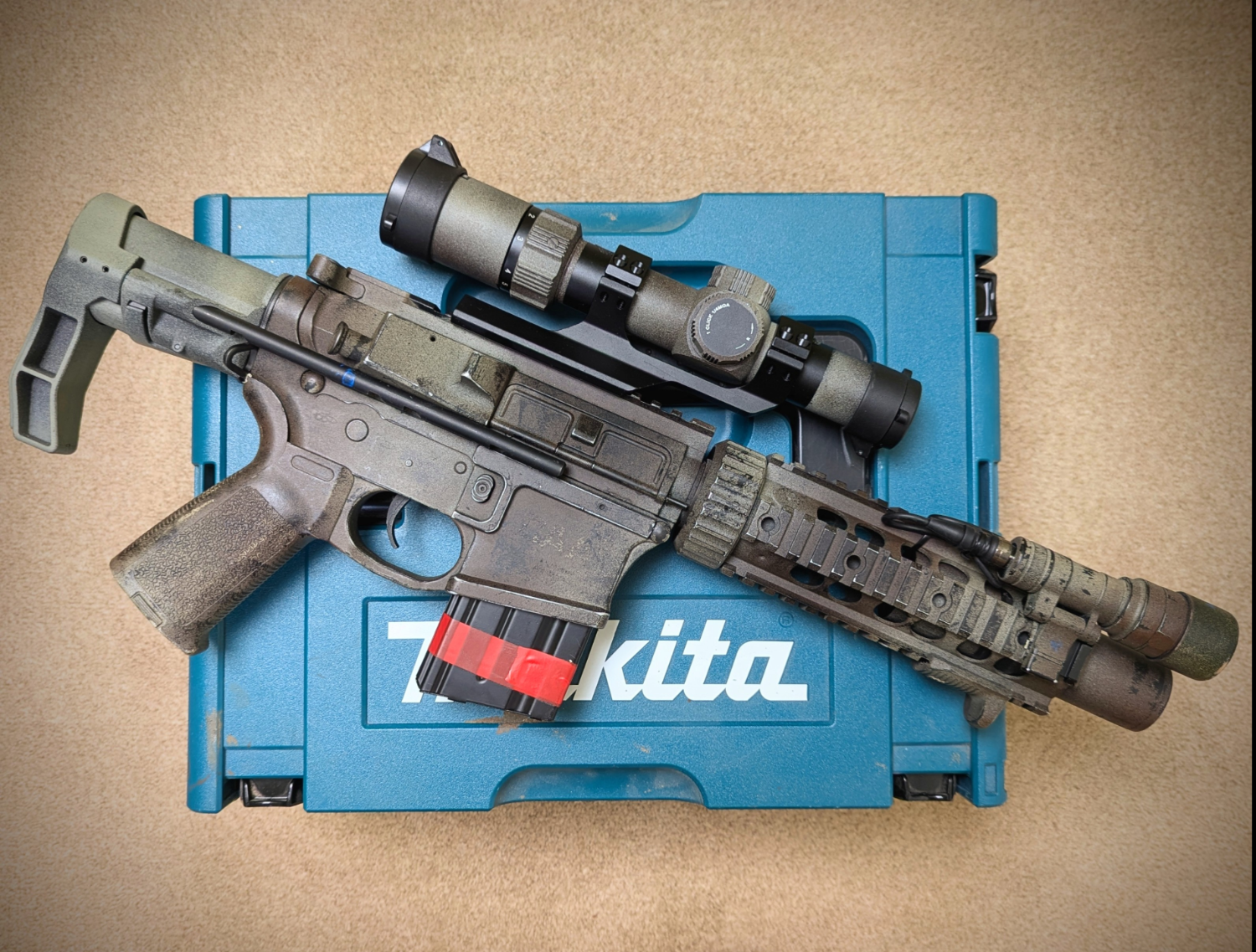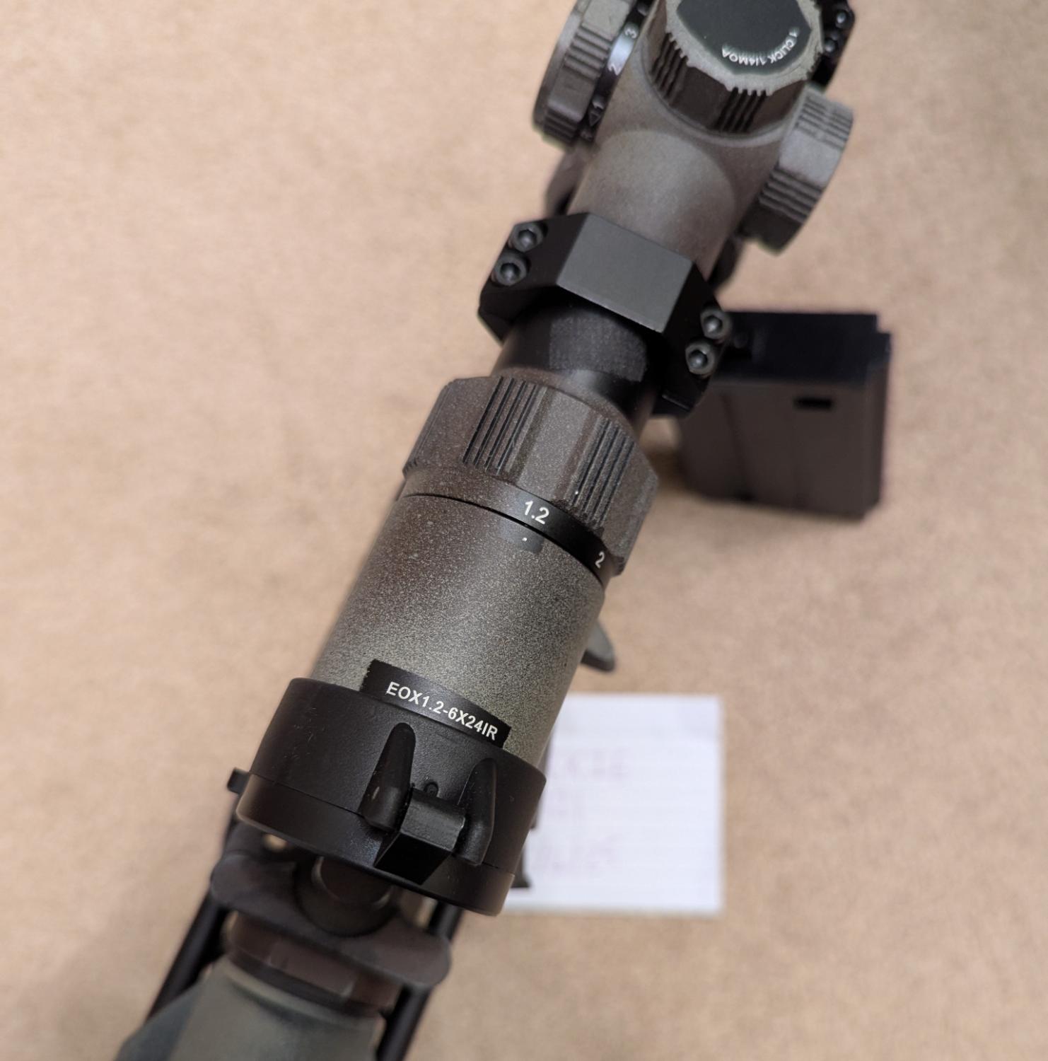 1.2-6x LPVO mounted on a cantilever up top, has a polycarbonate lens protector under the front flip cap to keep it safe from impacts. Nice clear sight picture, with red/green illuminated reticle.