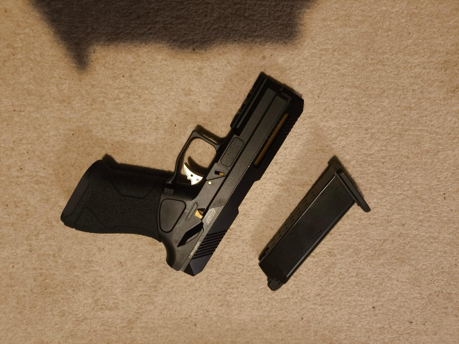 A lightweight metal slide is mounted upon a high strength polymer body. The slide is shallow with venting all over, so it is very gas efficient and quick to recoil. A trigger safety and rubber grip are included in the box, so you can fit to your own preference. The high strength polymer frame includes an integrated 20mm rail, perfect for a torch or laser.