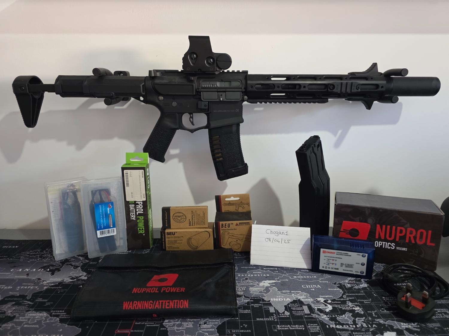 900 rnd mag, 2 x 2200 mAh batteries and 1 x 2600 mAh LIPO, plus battery charger and charge bag. Nuprol holographic, upgrades are inner barrel extension and hop up for tracer light up bb's, s high torque motor, suppressor extension unit, barrel stabiliser