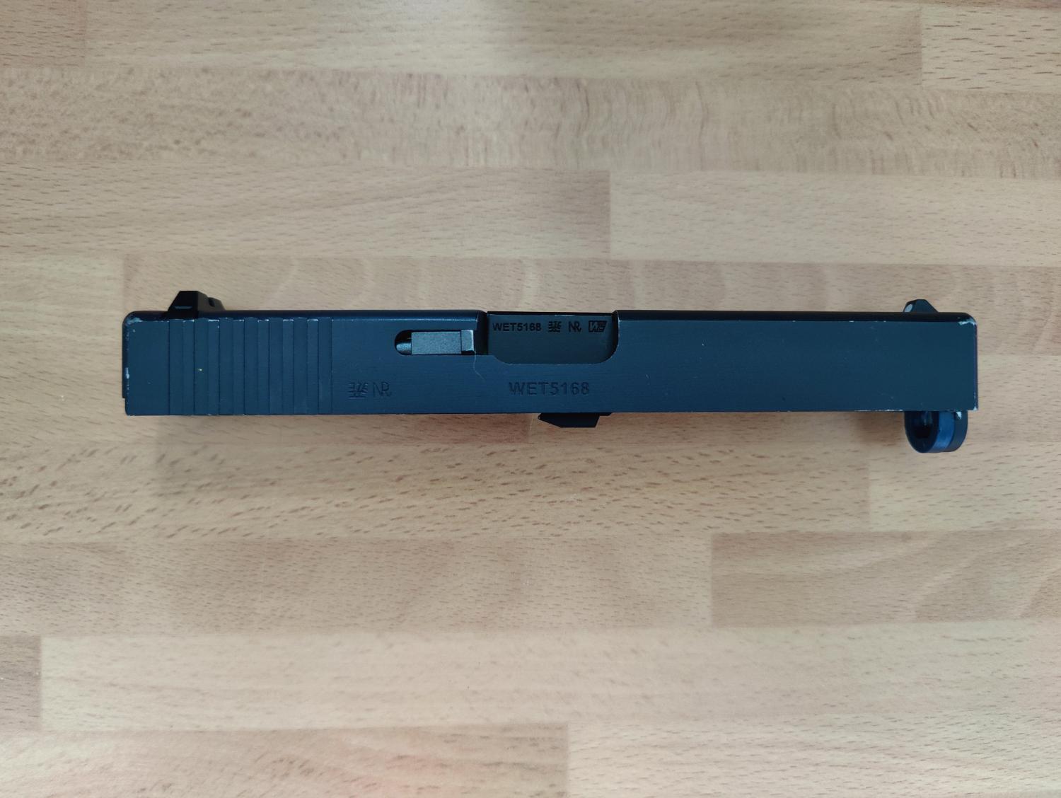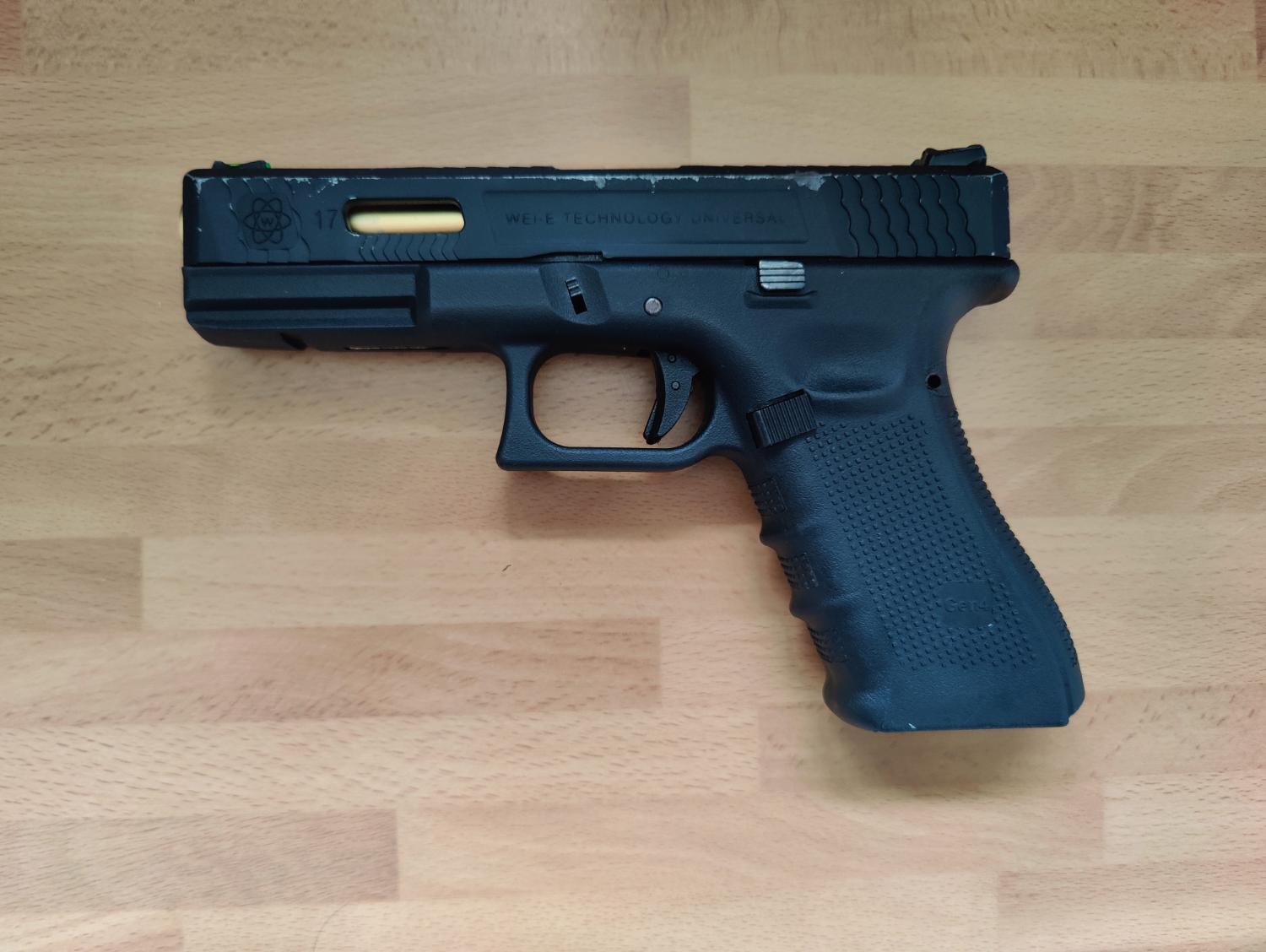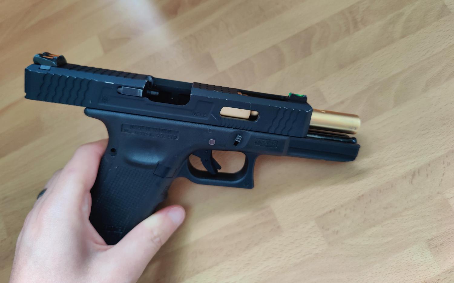 WE G17 Bundle. The main pistol is a used G17, with the WET Slide. The pistol is probably 4/5 years old, but rarely gets used, it still travels with me every game day, so I would suggest the outside is more worn due to getting banged around in my case. It comes with 2 fully tight WE CO2 mags, these have probably been used once. These come with an unbranded belt holder. The bundle also comes with 3 leaky/TLC required mags, 2 have baseplates. I believe the non working mags require new release valves. Included also is the original slide, outer barrel and nozzle set. The two backstraps and relevant pin also included. It also included a generic viper holster.