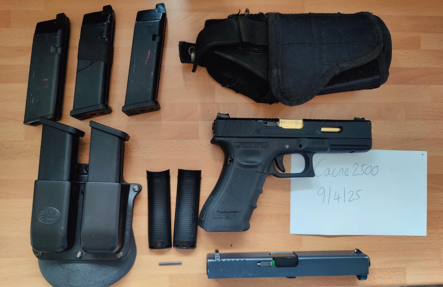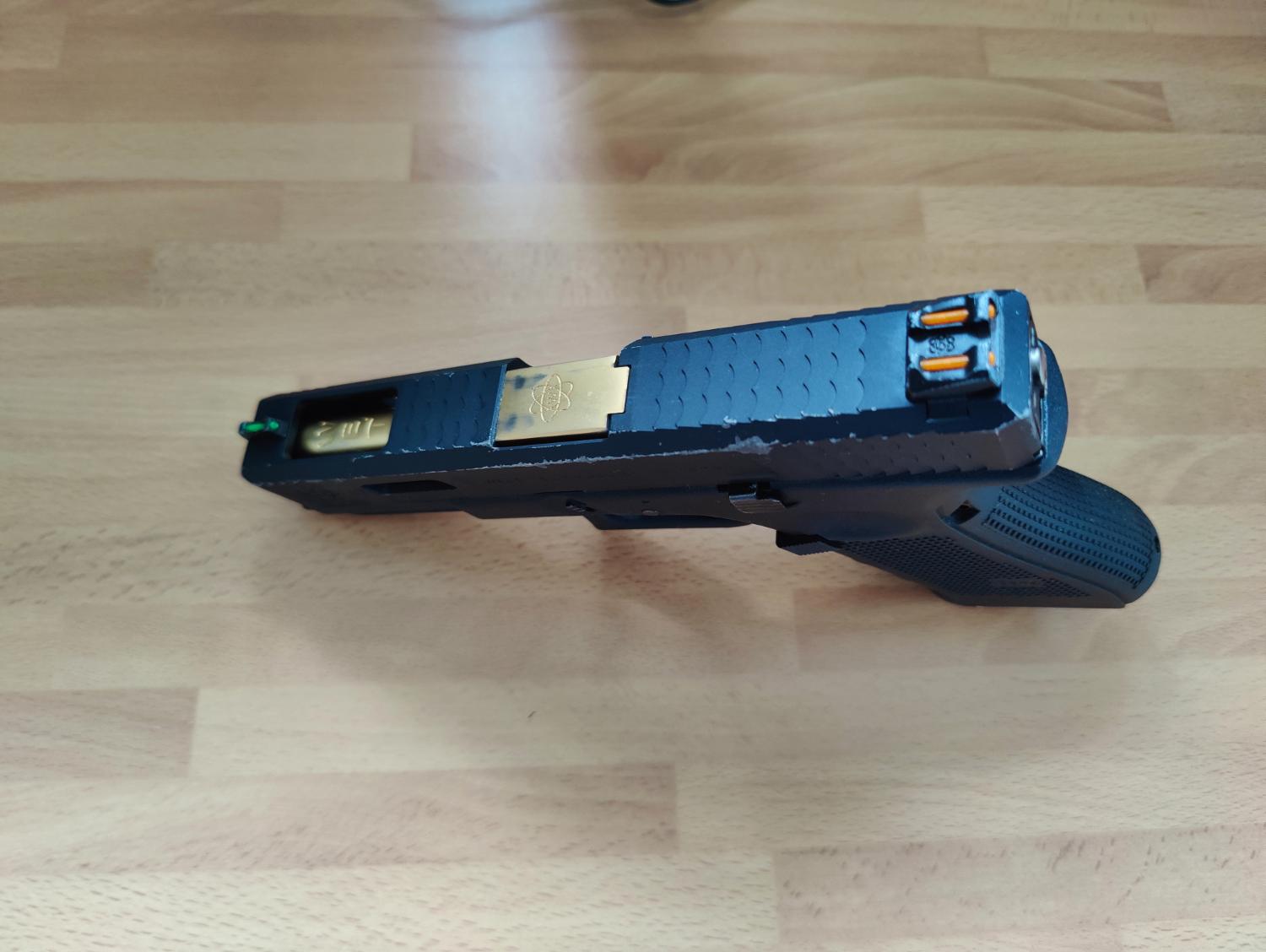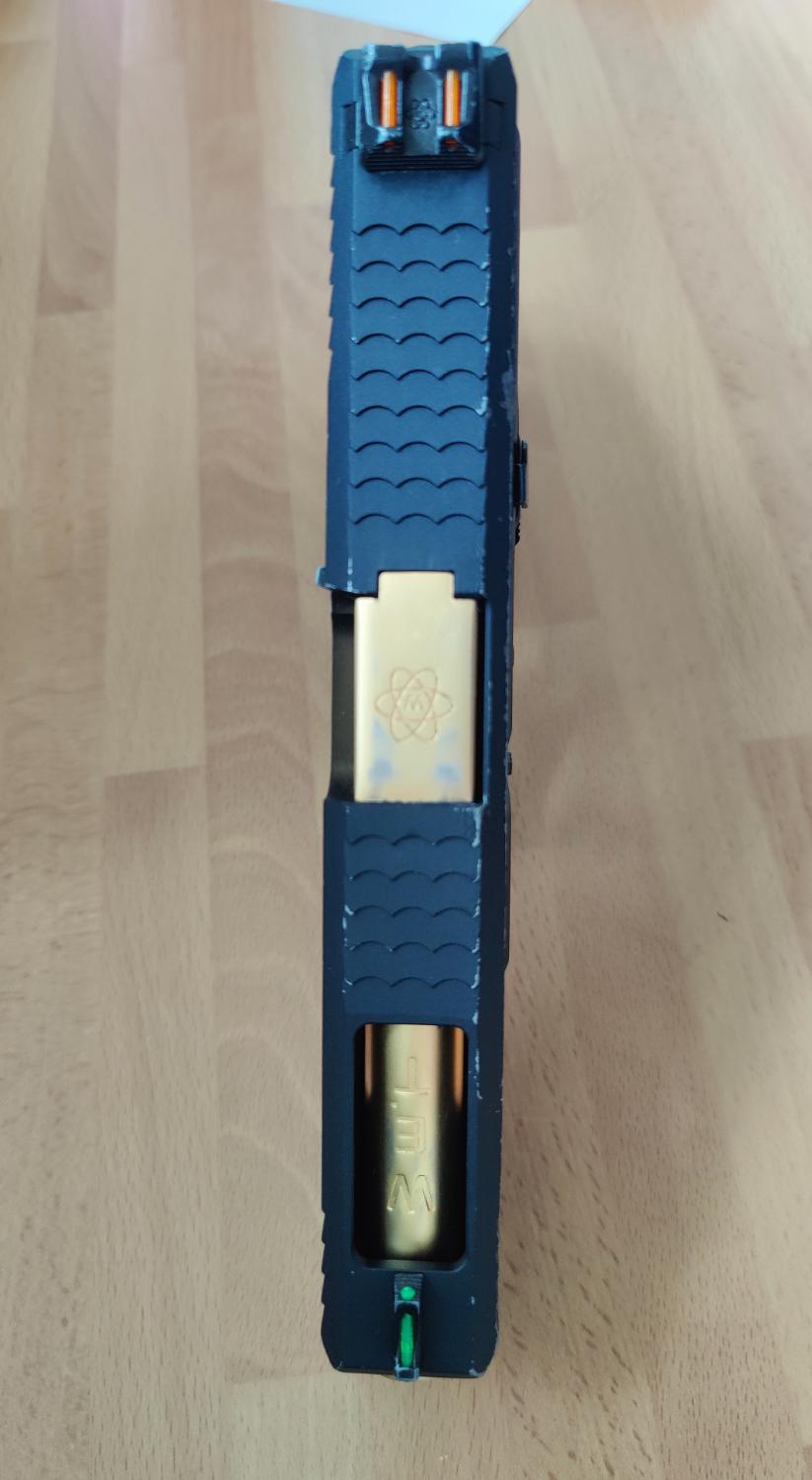 WE G17 Bundle. The main pistol is a used G17, with the WET Slide. The pistol is probably 4/5 years old, but rarely gets used, it still travels with me every game day, so I would suggest the outside is more worn due to getting banged around in my case. It comes with 2 fully tight WE CO2 mags, these have probably been used once. These come with an unbranded belt holder. The bundle also comes with 3 leaky/TLC required mags, 2 have baseplates. I believe the non working mags require new release valves. Included also is the original slide, outer barrel and nozzle set. The two backstraps and relevant pin also included. It also included a generic viper holster.