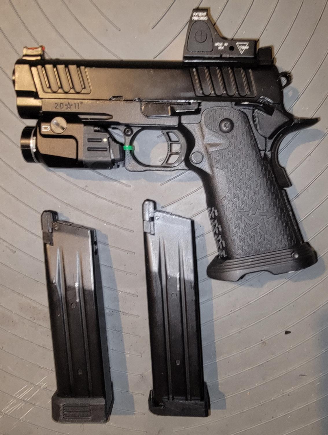Emg staccato c2, upgraded hop rubber and barrel, grub screw in trigger to make it adjustable. Magwell, clone rmr, brand new tlr7a clone, 2 mags £170