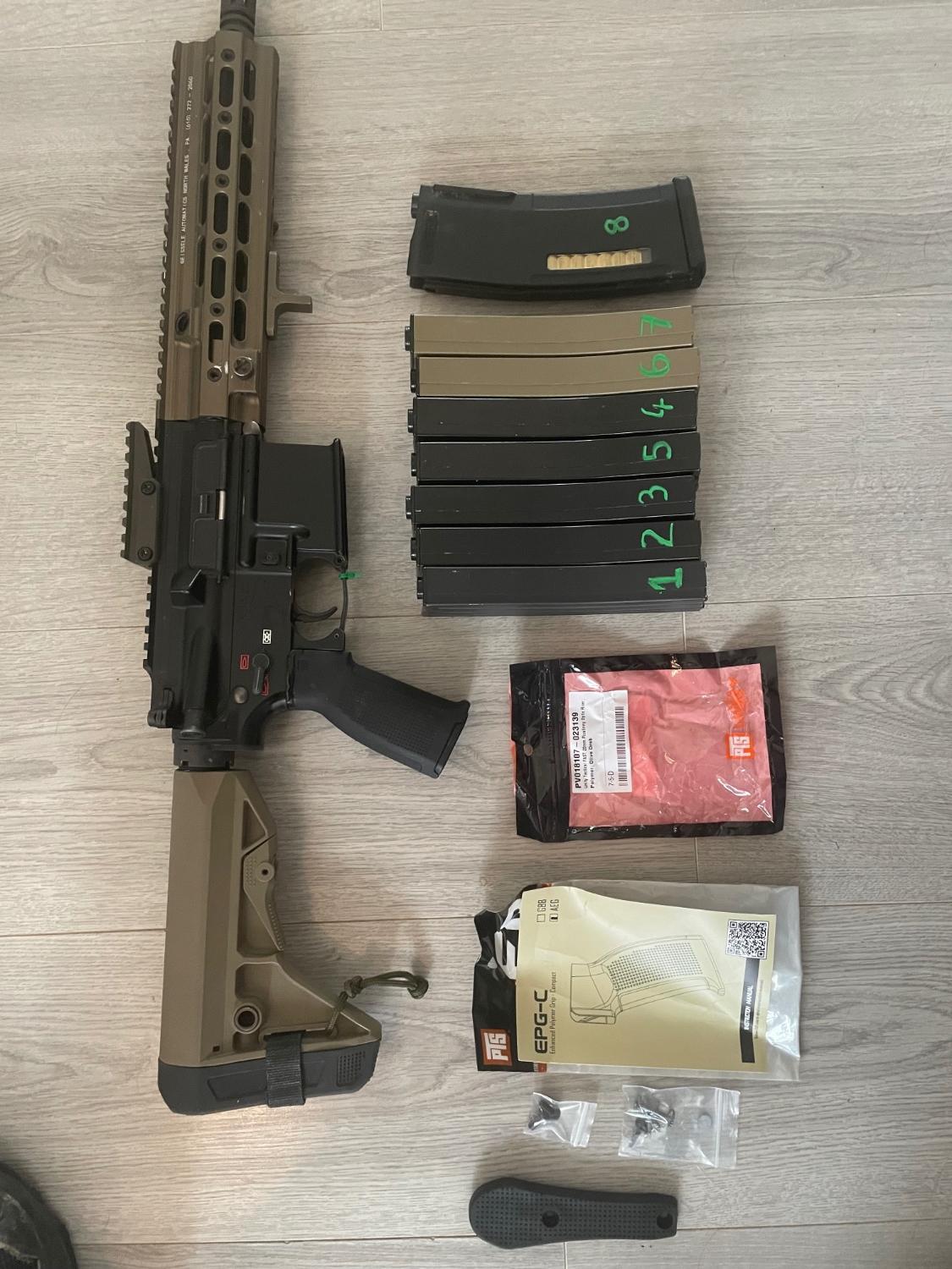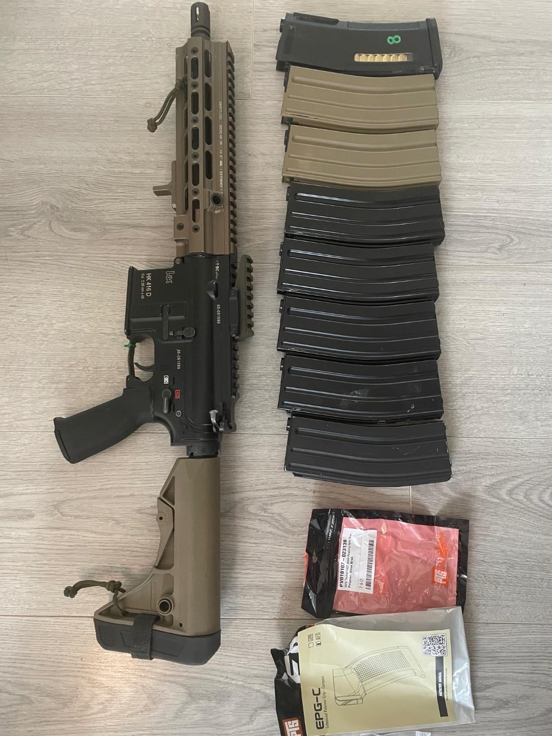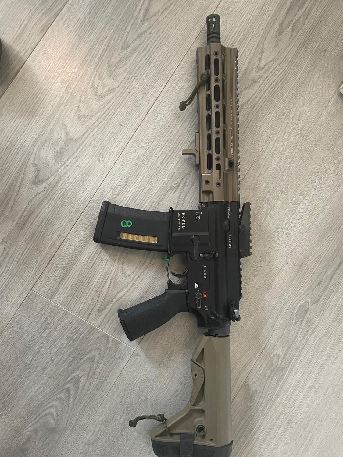 Tm 416, good few upgrades form cage airsoft like titian, promy hop rubber and nub also tight bore stainless inner barrel , pts bits all over, 7 ngrs mags and 1 pts.