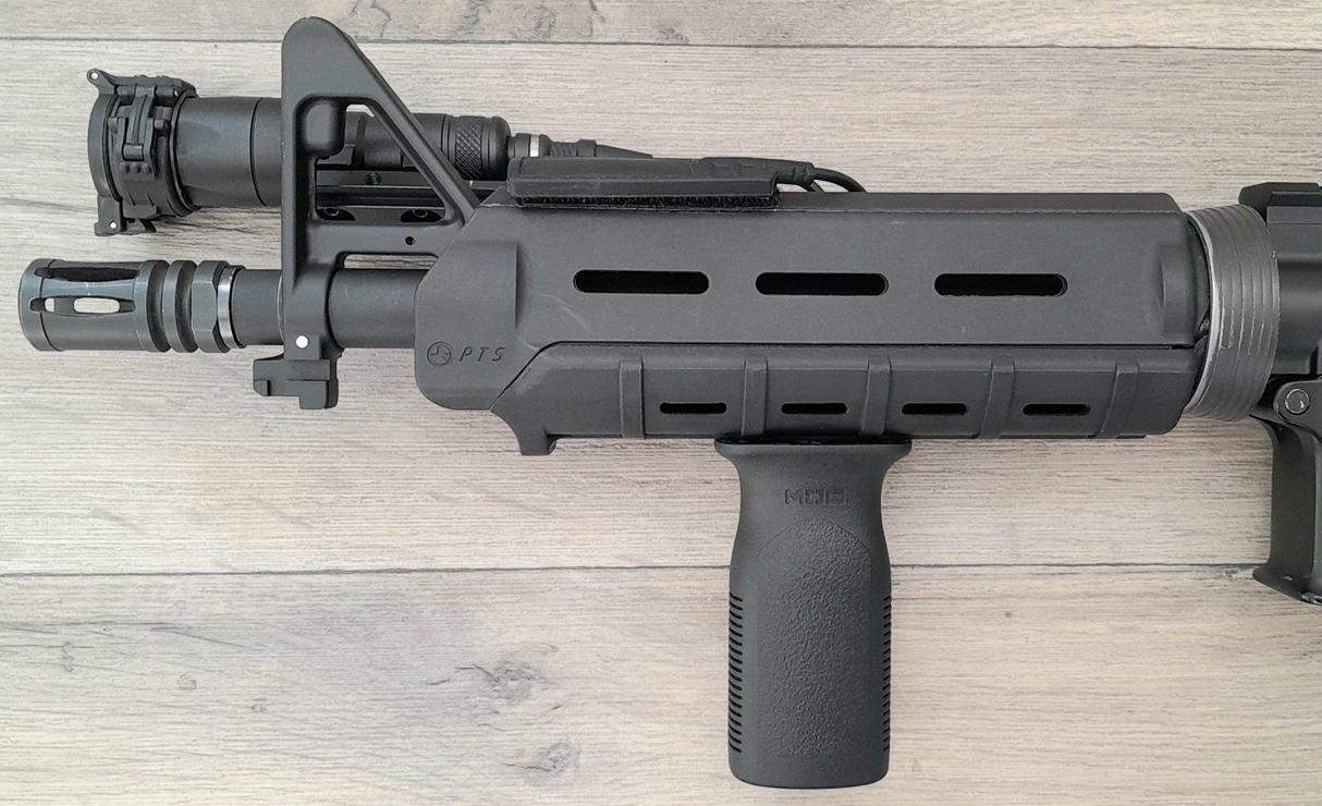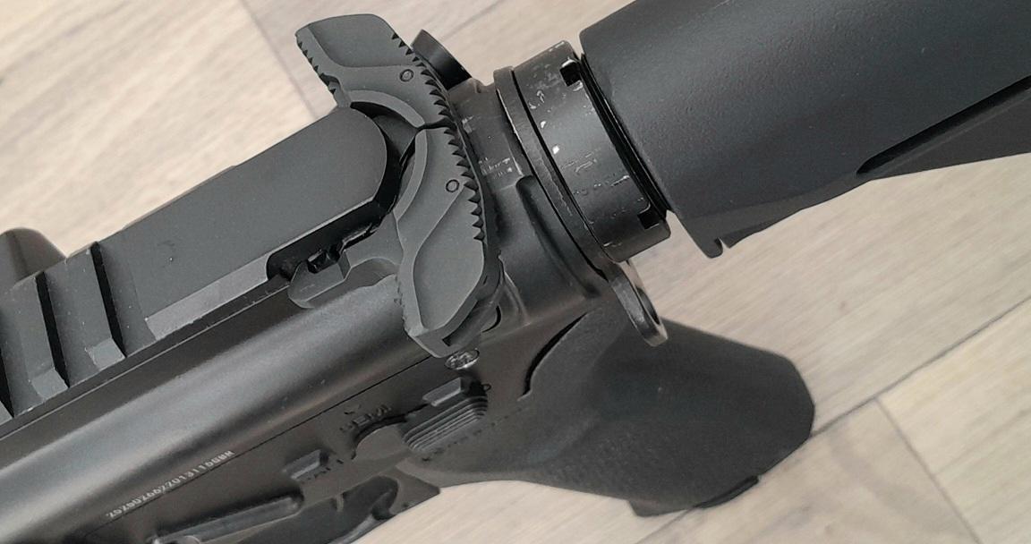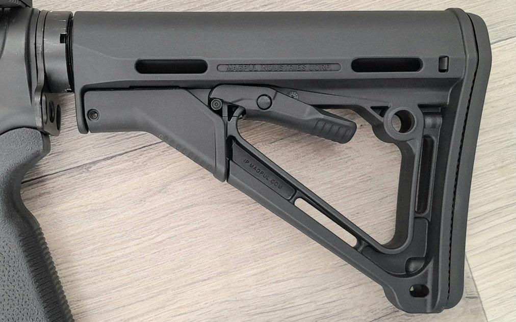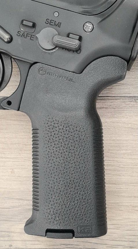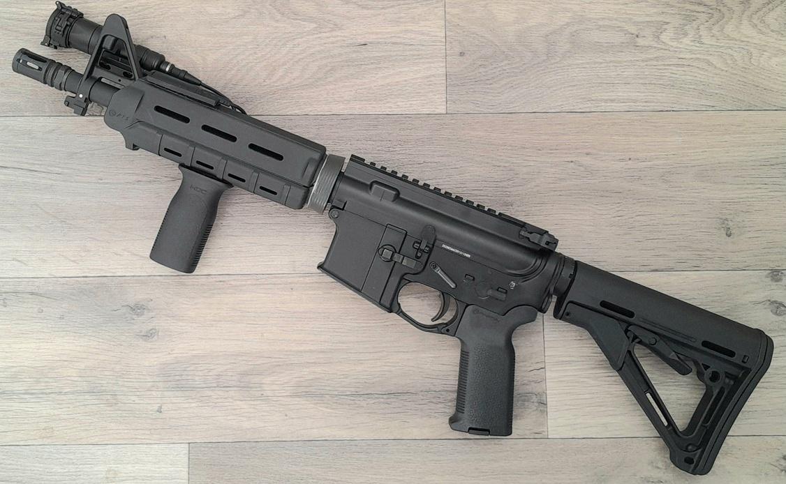 This has had the furniture replaced with Magpul items, with trades and markings, but I don't fully know much about them? I also purchased a BCM Ambi-cocking handle.
