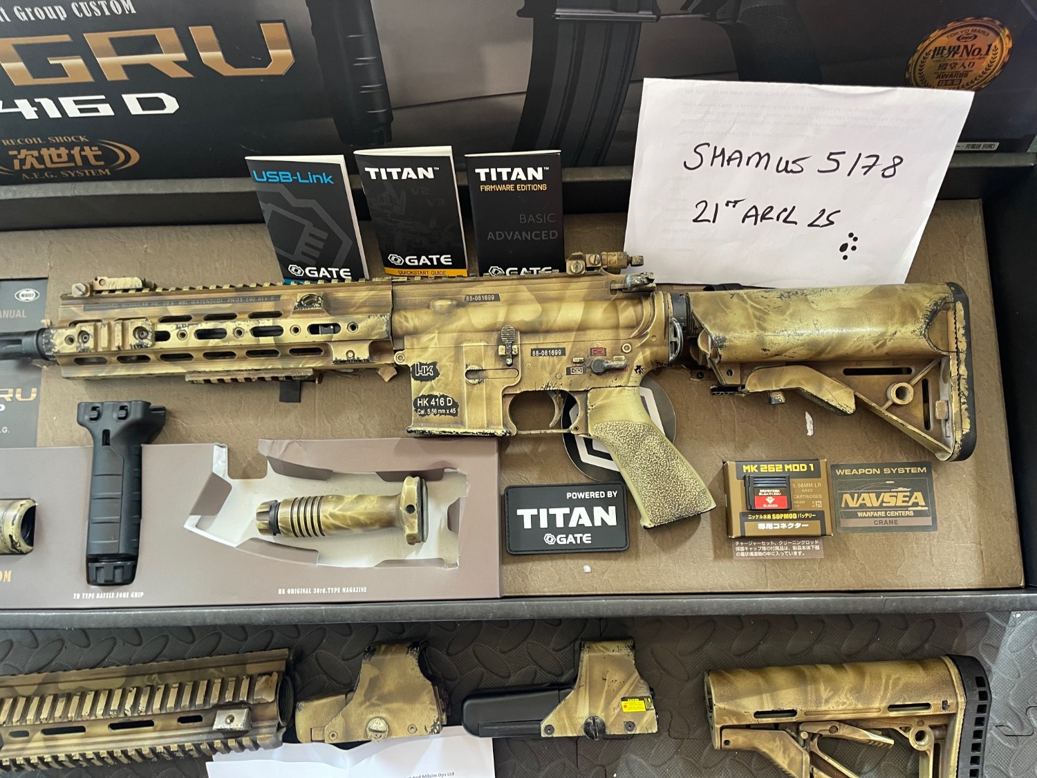 Professionally painted by Geartech custom. All parts were painted at the same time. Comes with ASG Crane style stock, Magpul clone CTR Stock with 3D printed but pad for battery. Down grip, and two clone eotech type sights, both work. Wired to deans. Full shebang done by camoraids (gate titan, edgi barrel, sub 350 FPS ect) Paper work included.