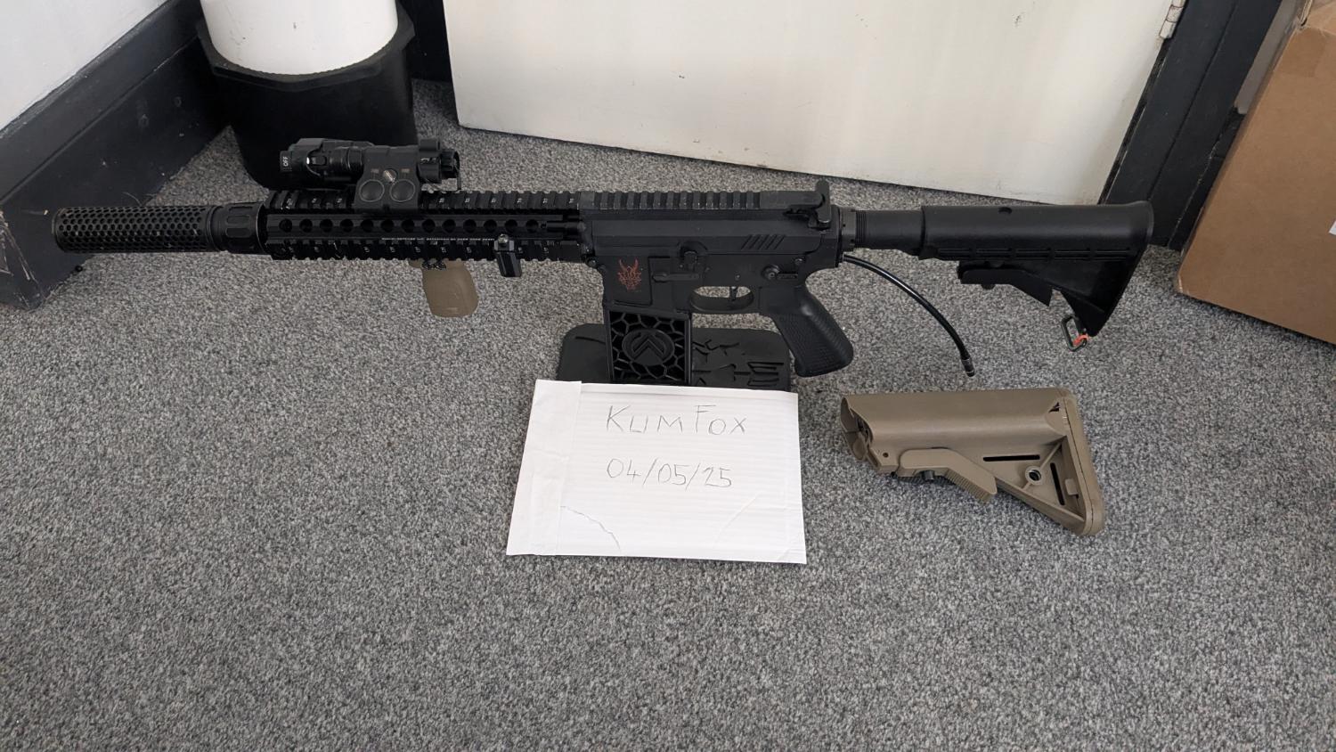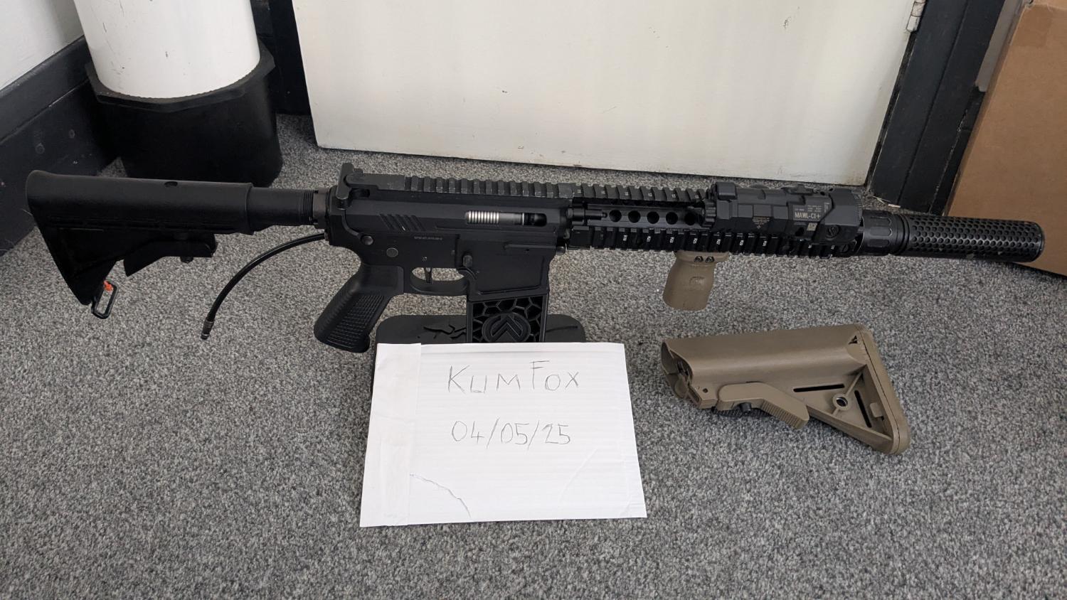MK18 rail assembly, quick detach suppressor, MAWL-C1+ fully functioning Ir lazor, light and lazor, stubby vertical grip and two stocks.