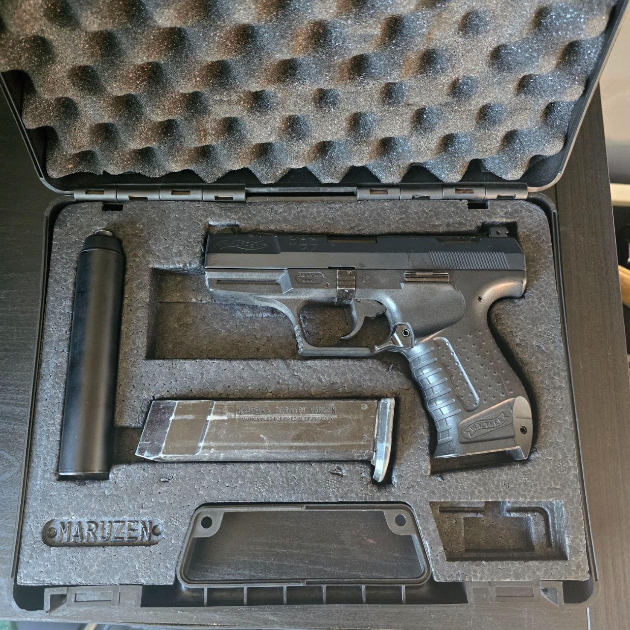 Non blowback Maruzen Walther P99 with x1 magazine, hard case and suppressor.
