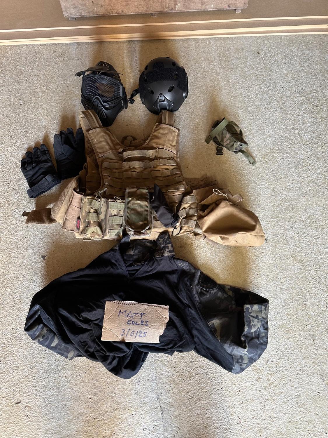 body armour, 2 helmets, gloves (new) new camo top says 3xl but more like 2xl 3 full bottles of bbs on full gas 30 gas canisters for pistol and a new hard carry case everything to get you started £350 Ono