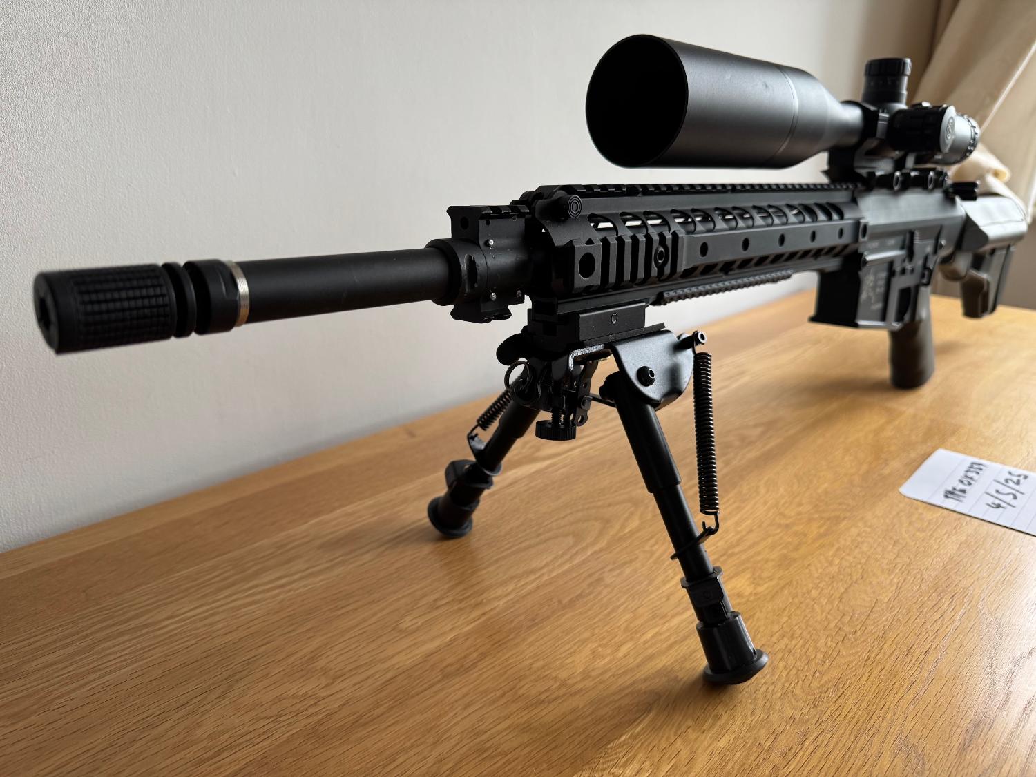 I have owned this SR-25 from new, it’s never been out the house, never been to an Air Soft site and only about half a mag shot through it. The condition of the rifle as a whole in clouding everything that makes up this package is as new with the exception of a couple of minor marks on the gas block due to it having to be slightly modify it to fit the longer G&P front end. The gearbox is completely untouched but as the rifle has been stored for a few years and not been touched please expect a service and maybe a new spring is required before use.