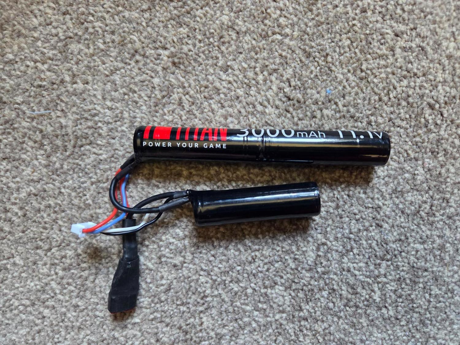 Comes with an 11.1 Titan battery, inert rounds and the rail covers.