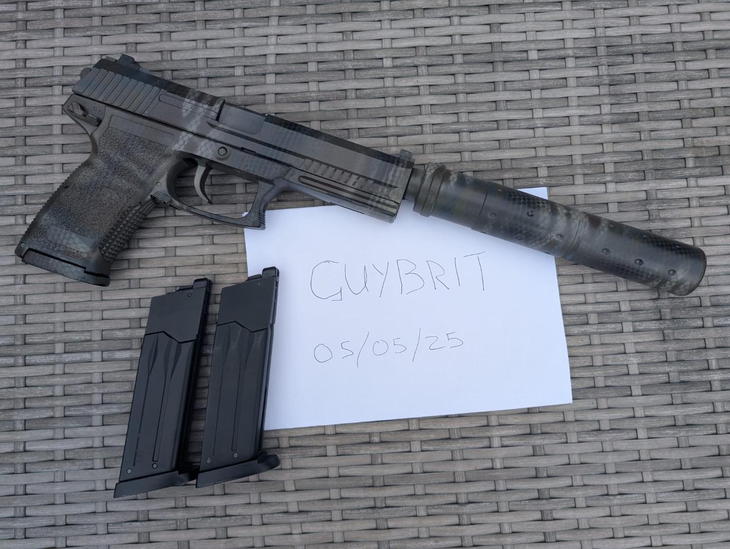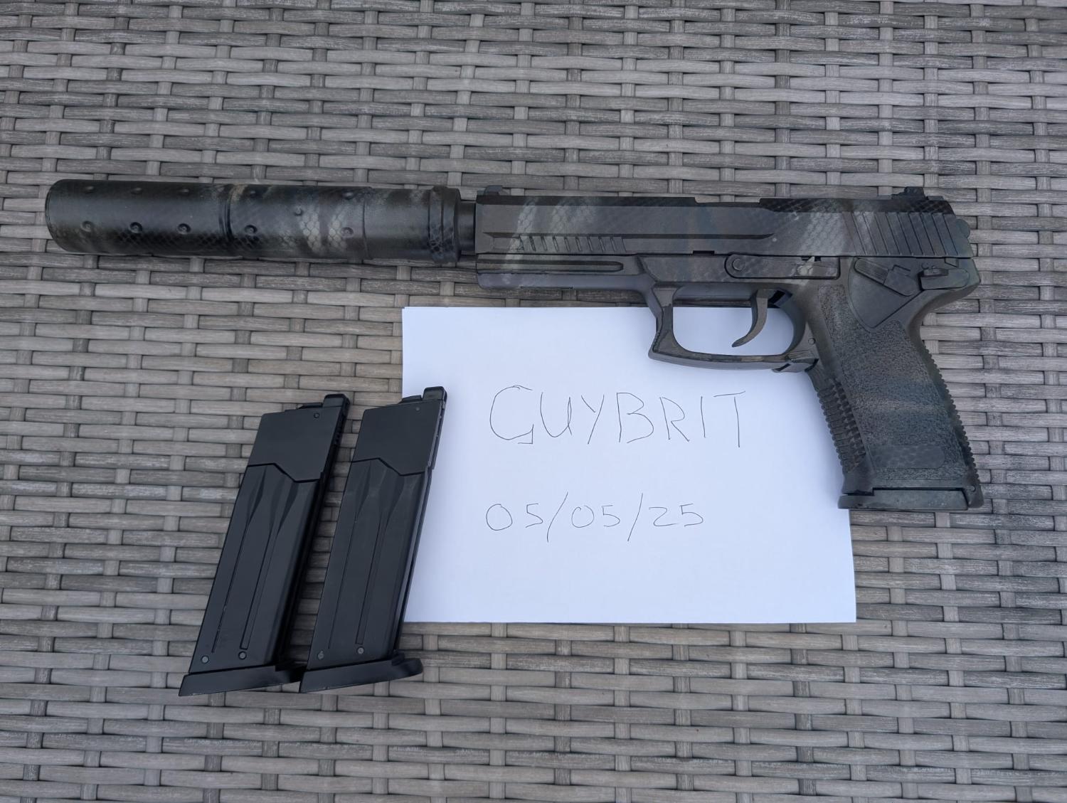 Mk23 with custom camo paint job and 3 mags and extended barrel supressor