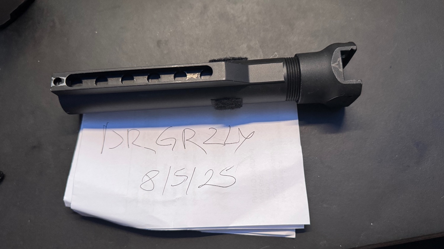 Few scratches, comes with the adapter and the buffer tube. Can be used with any gun with a picatinny rail at the back.