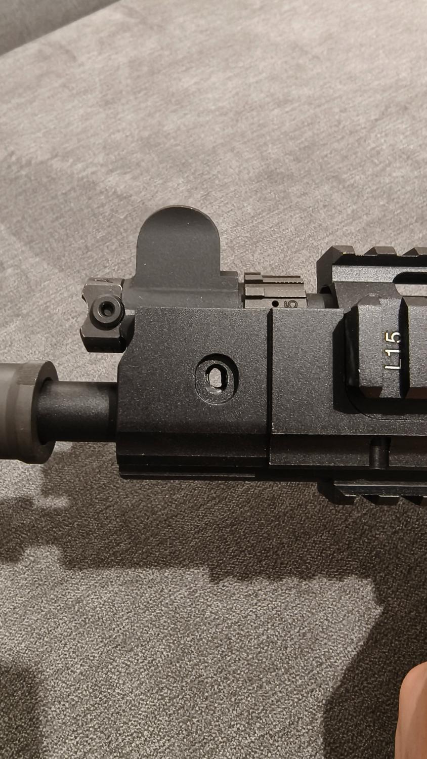 Two holes were drilled on the top to fit the dust cover connecting pin. Then the inner front bit was filed to fit the size of the gas block. All shown in pics