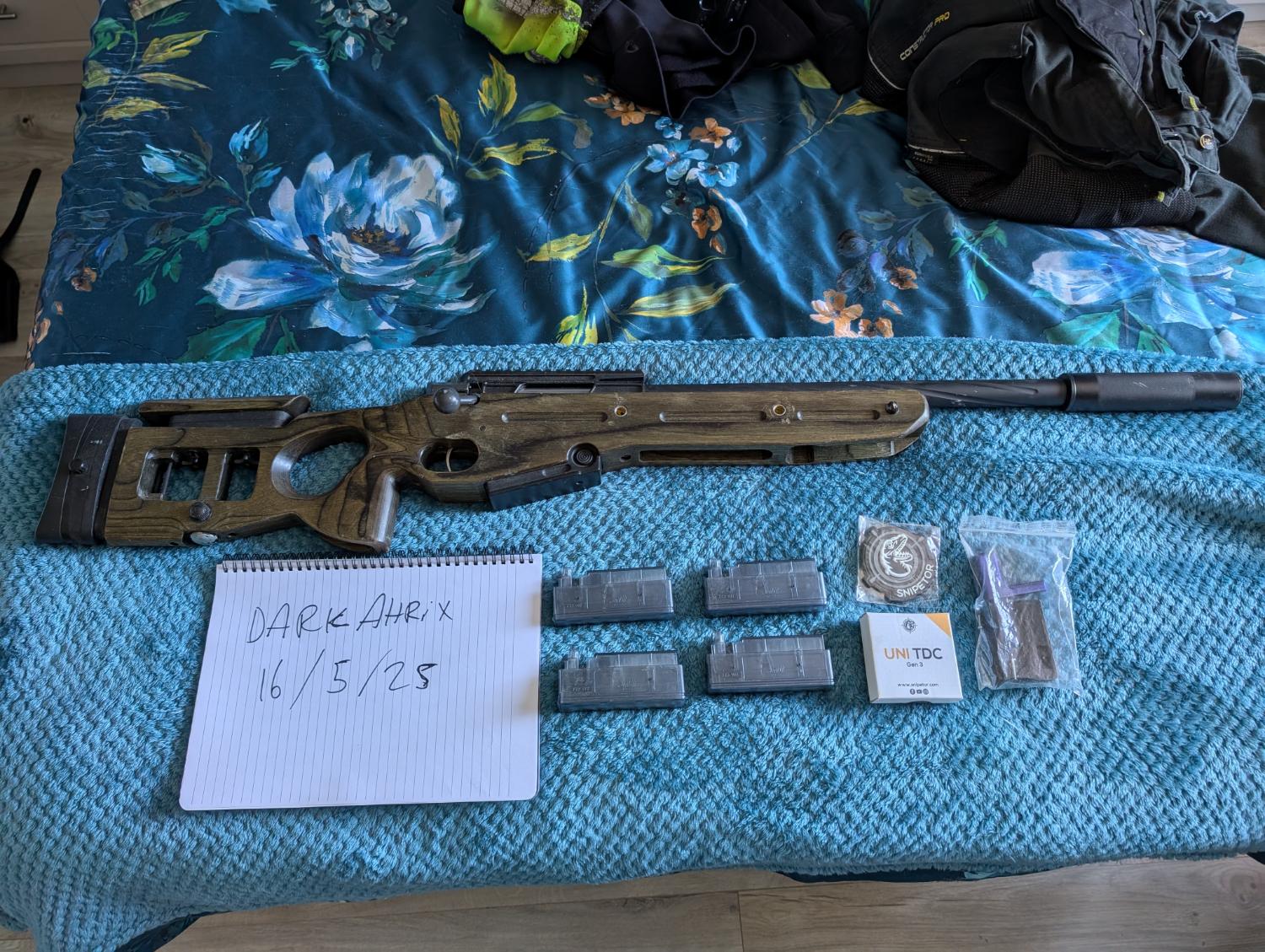 Well l96 inside a discontinued apringer custom SV98 carved body, external twist outer barrel shortened, 6.01 tight bore, maple yellow rubber, Action Army hop chamber comes with 4 action army mags, also comes with an uninstalled snipetor external tdc kit asking £350 +£10 P&P