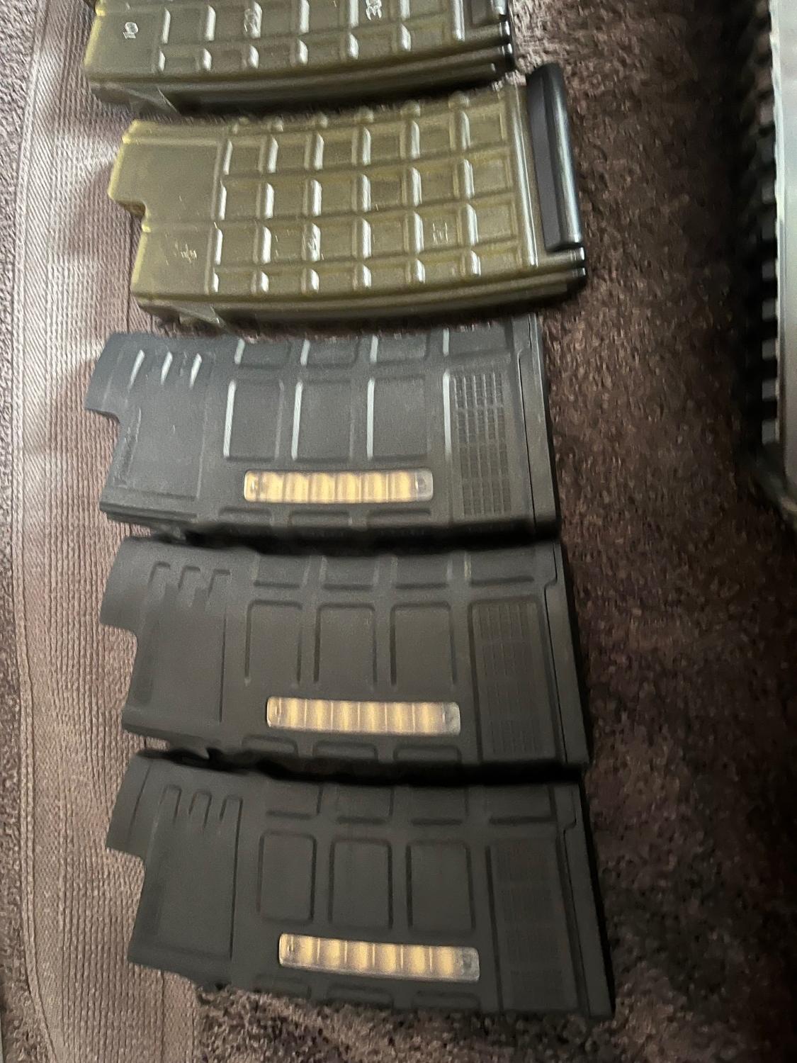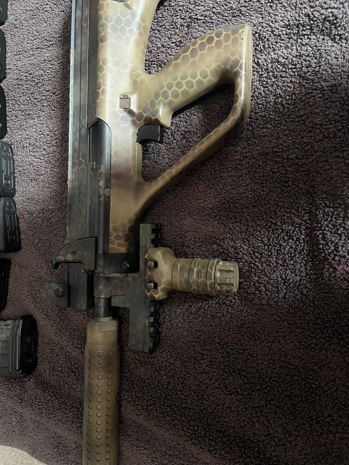 There are 8 mags total, 1 hi cap with the paint job, 3 translucent mid cap mags (can’t remember the capacity) and 4 battle axe Aug mags, 3 of which have been modified to fit correctly and one in-modified.