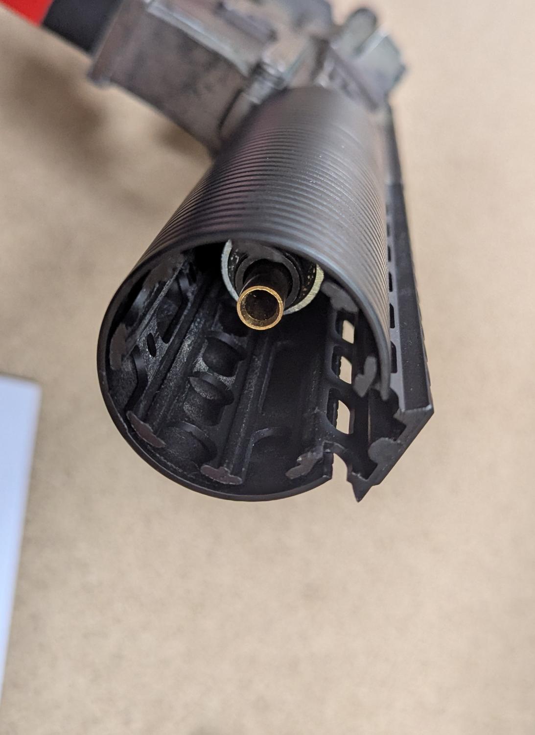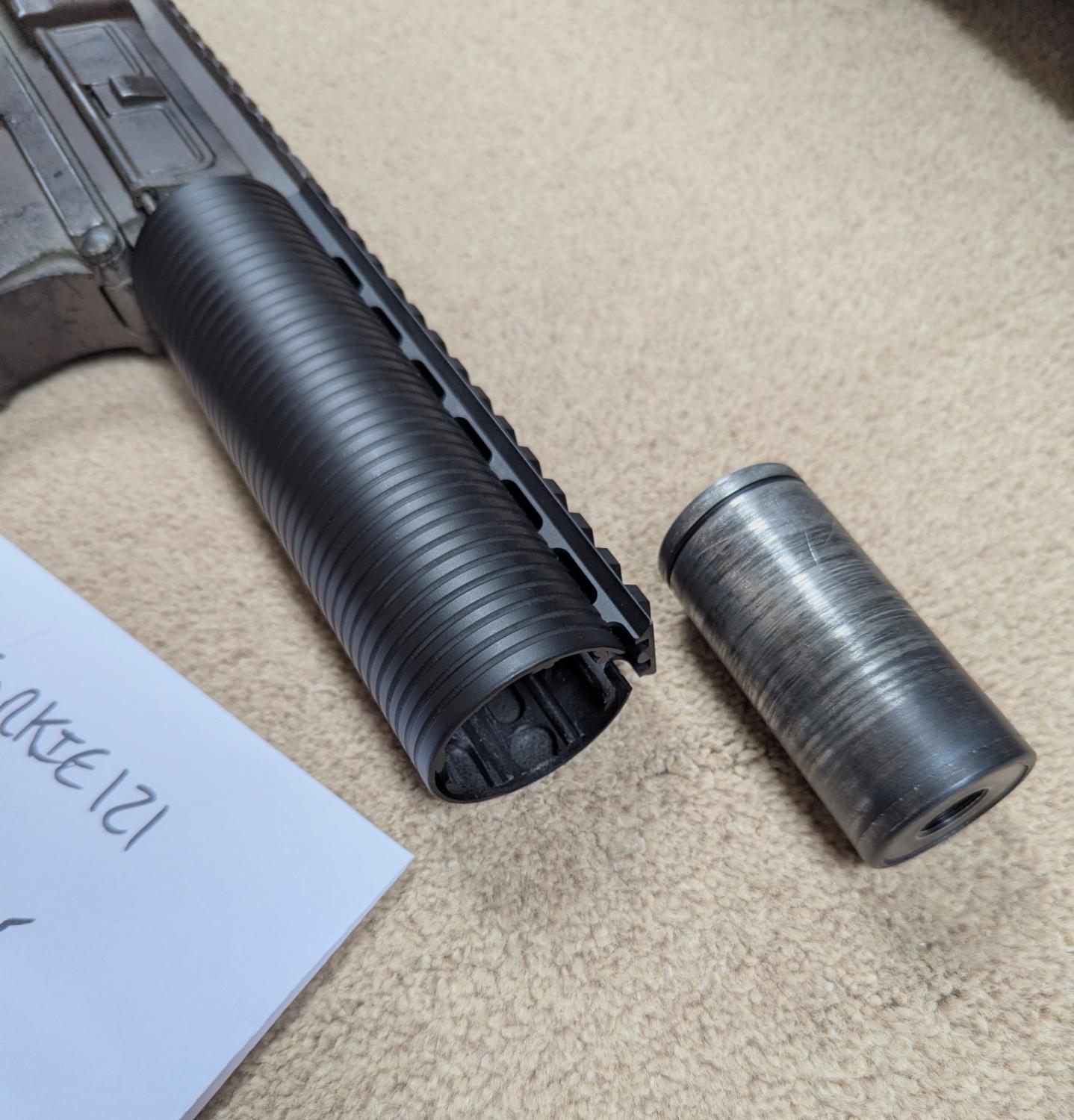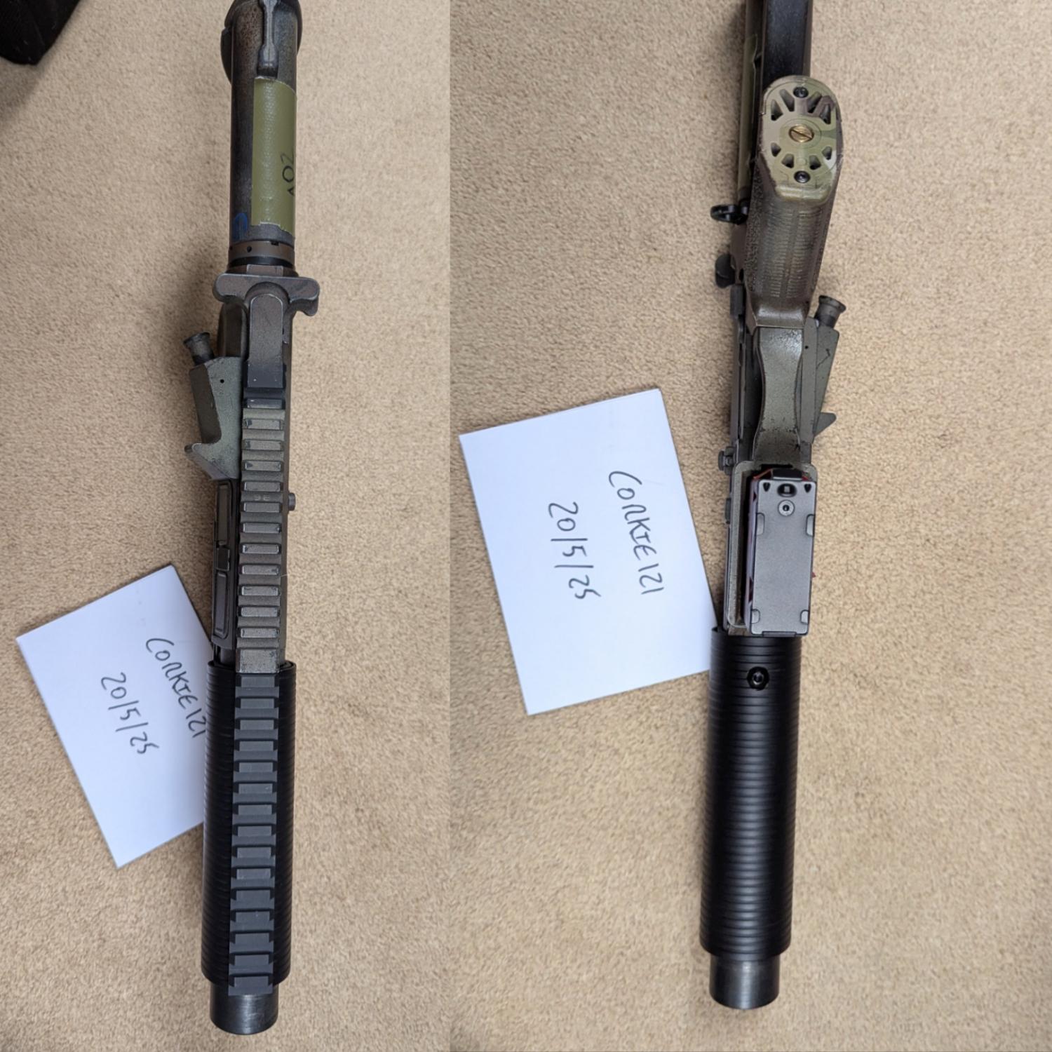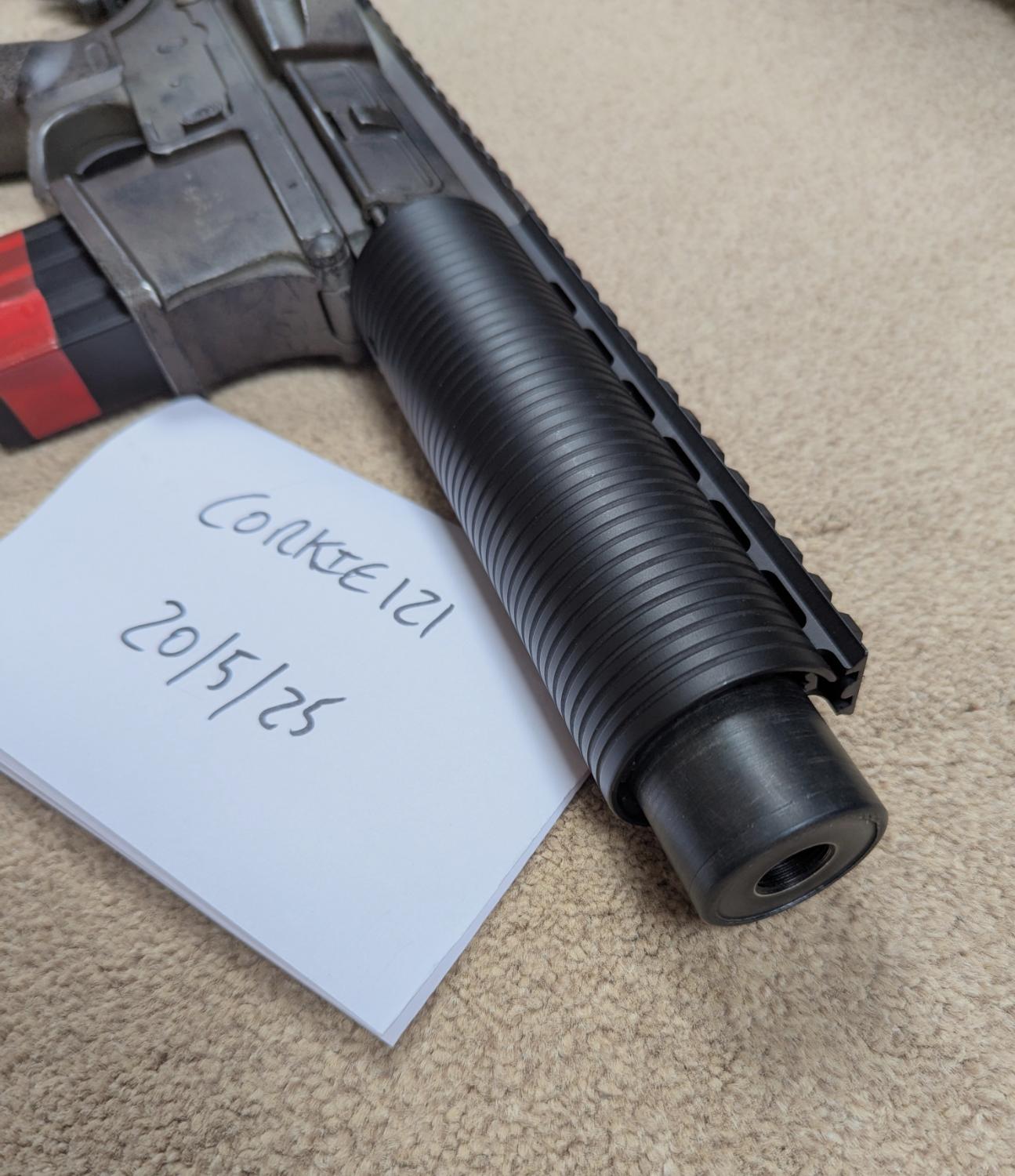 Front end uses an NSR rail with aluminium sleeve over top, has been lathe grooved to mimic the HK SD line, and takes a stubby suppressor underneath. This can be opened at the front to accept a tracer, or kept with the foam inside. Overall front end length is around 7" so nice and compact.
