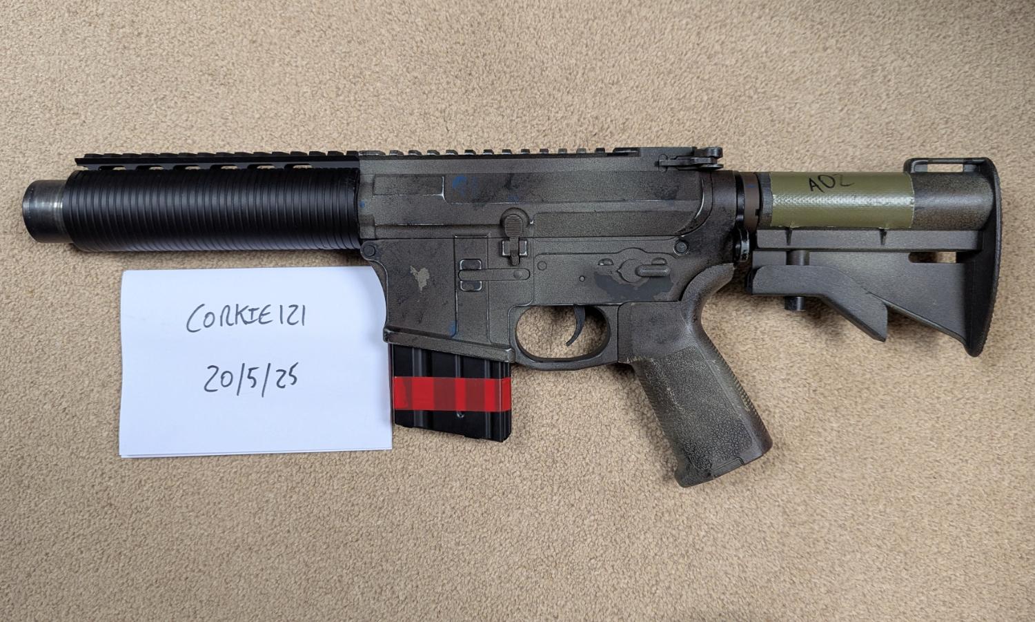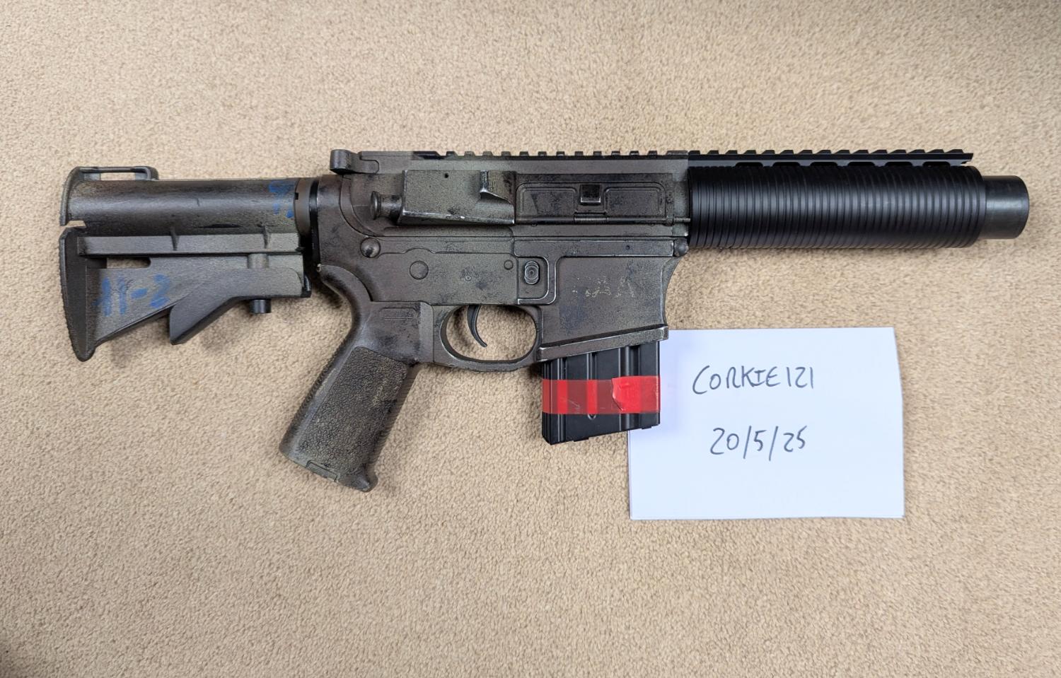 Custom made aluminium front end, shortened XM style stock and buffer tube. Full metal body with built in trigger guard.