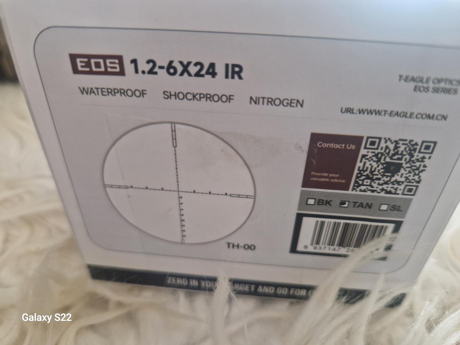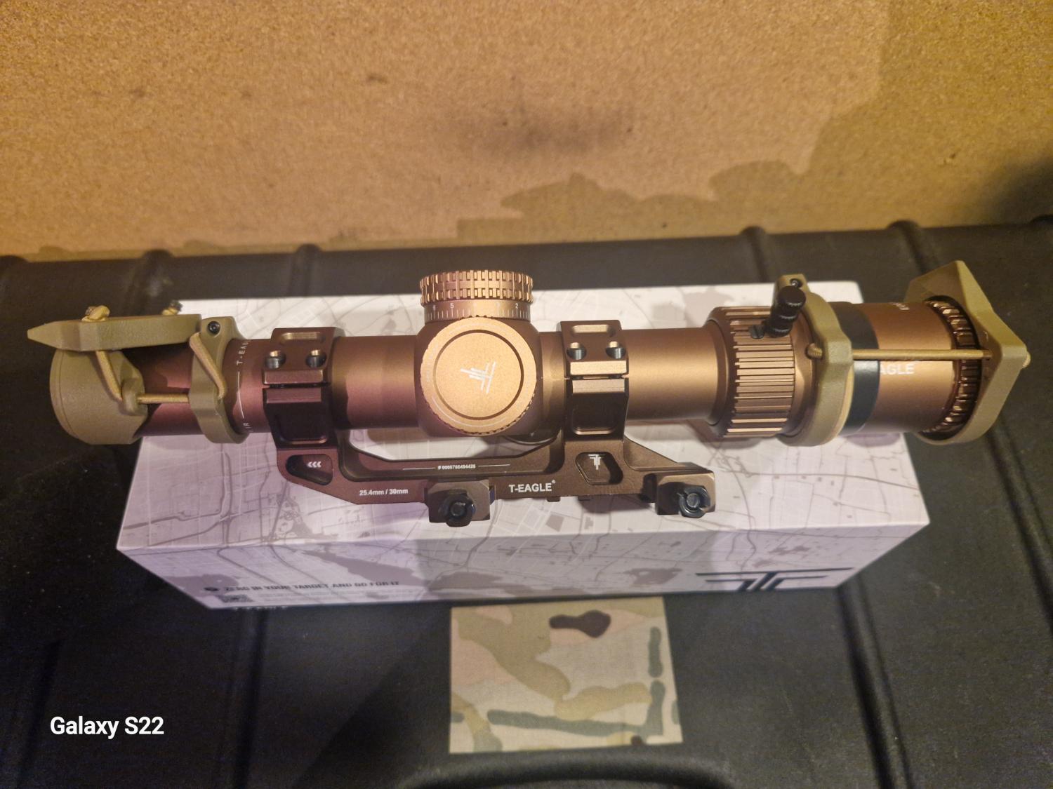 T -eagle,1-6 x24 lpvo short dot illuminated,numbered 3 colour mildot cross hair, reticule. superb finish,bronze colour,comes with locking turrets,covers and kill flash,super duty mount,throw lever,sunshade,boxed as new.cleaning cloth and instructions.