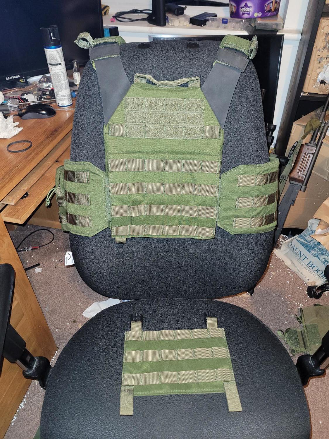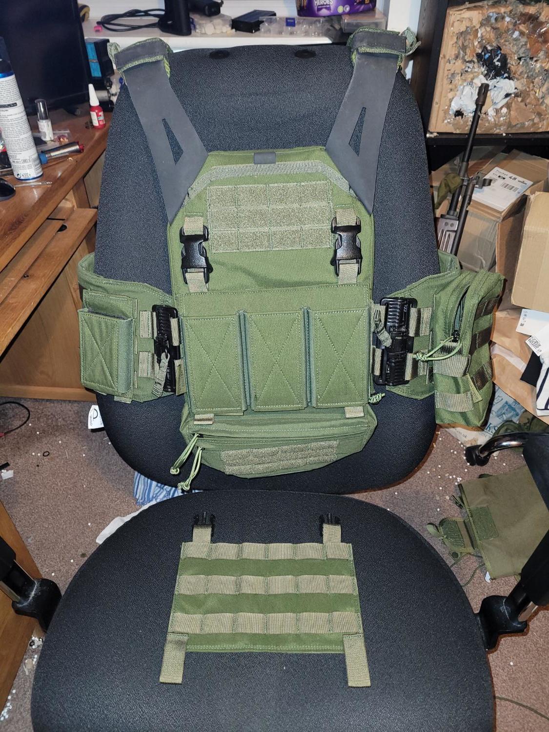 Includes plate carrier with solid cummerbund, elastic 3 mag panel, blank molle panel, single elastic pouch, small utility and dangler pouch.