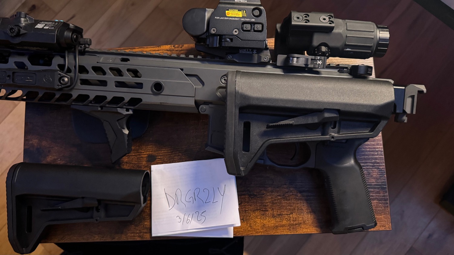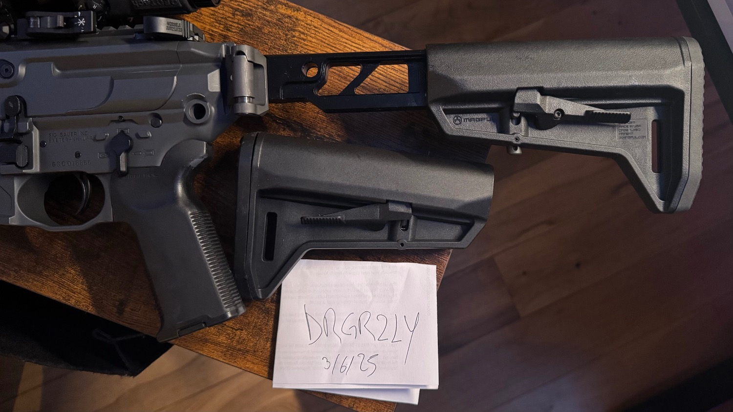 Selling both, prefer together. The replica stock is the one without trades, it is slightly smaller than genuine magpul sl-k you can see the sizes in the photos.