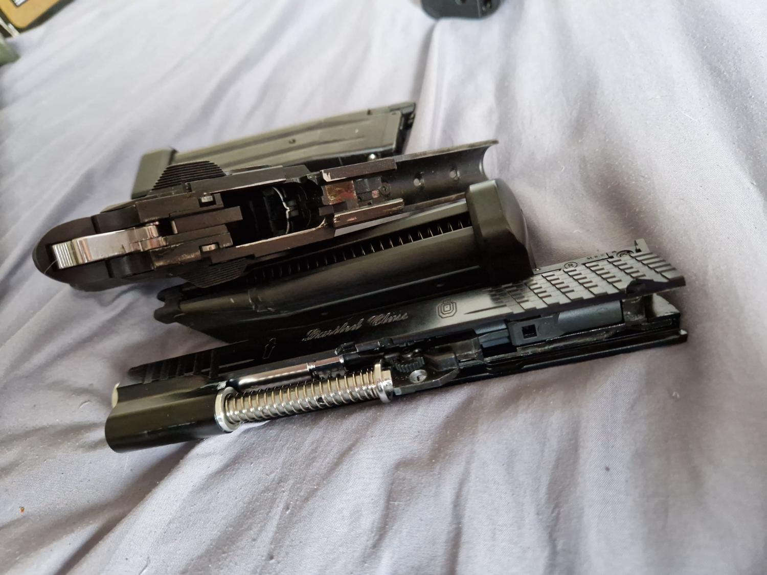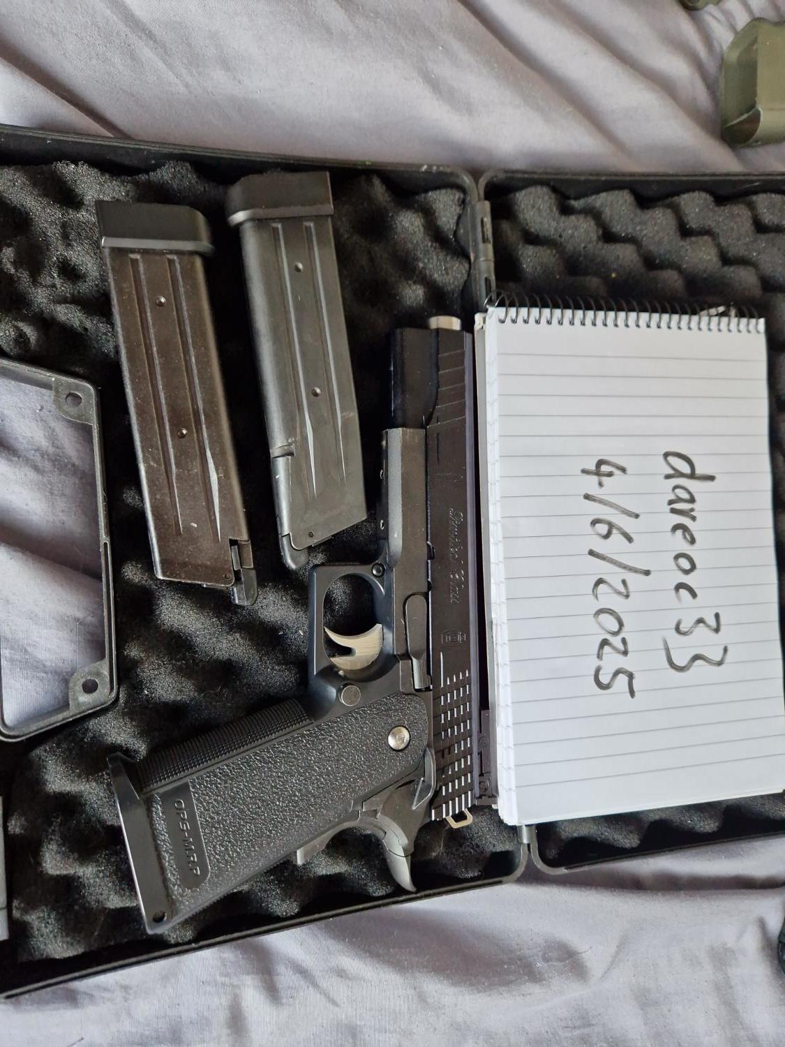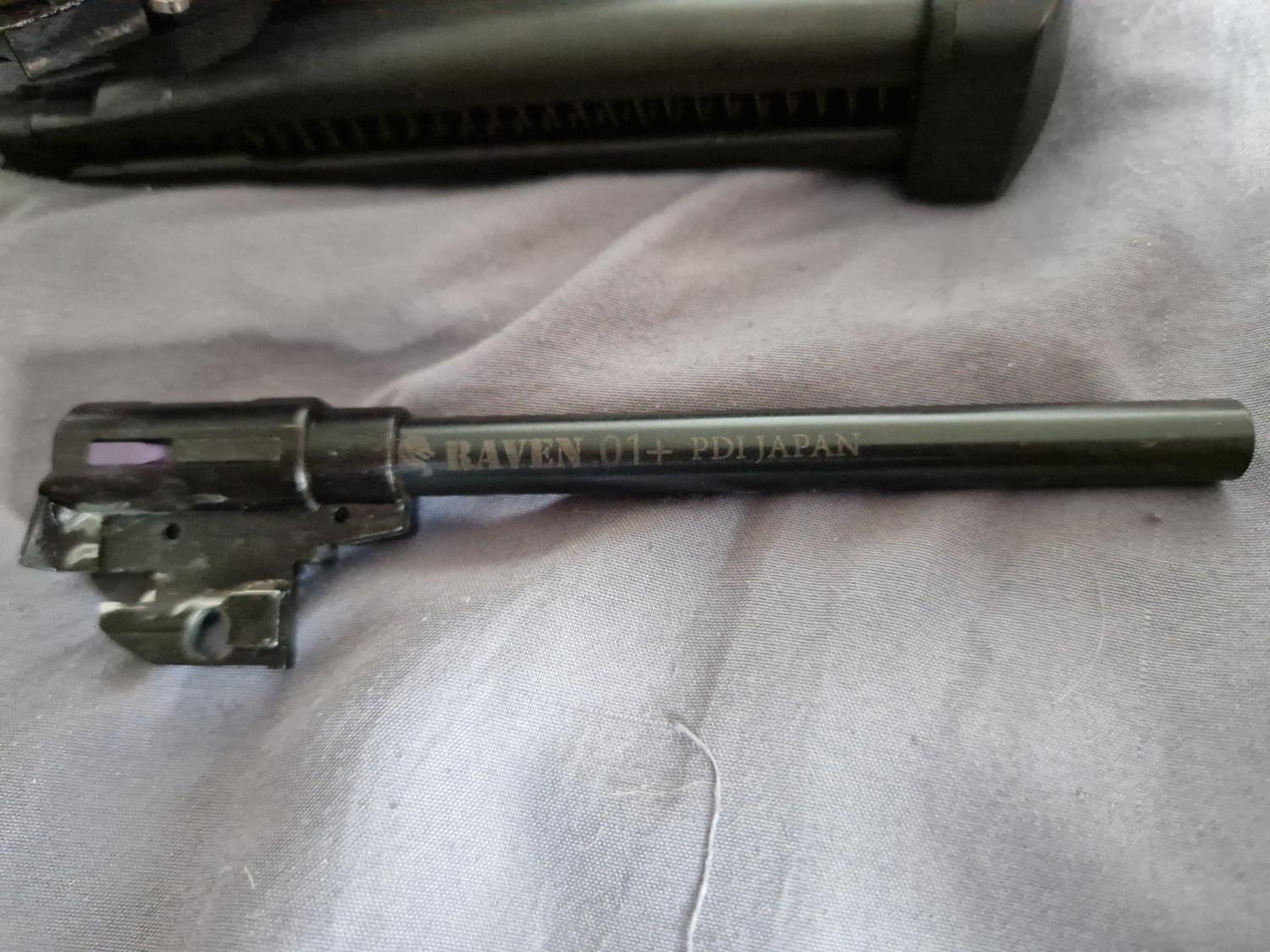 TM hi capa with a shuey custom metal slide a pdi 6.01 barrel and what looks like a purple prommy hop rubber. The trigger is also aftermarket but I'm not sure what it is. Really crisp action on this. Comes with 2 gas tight TM mags and a hard case.